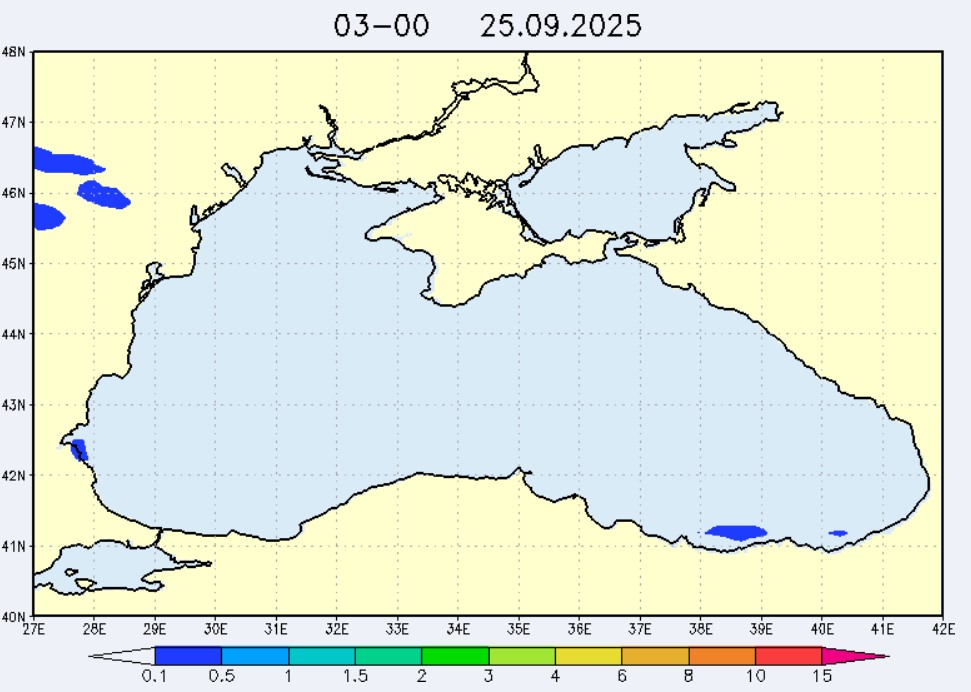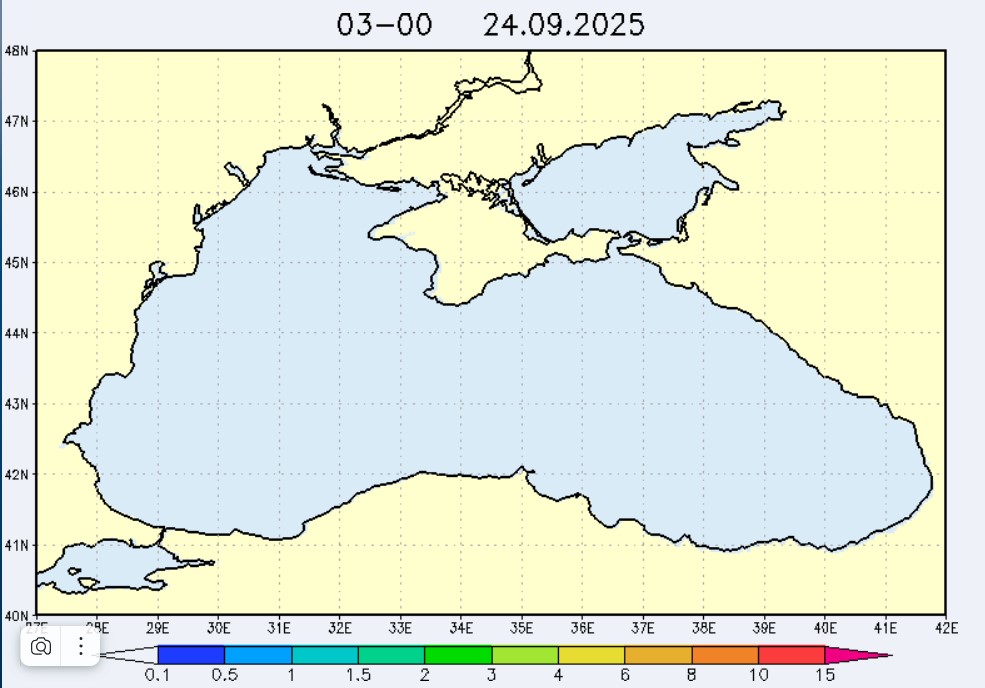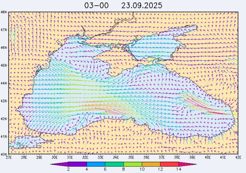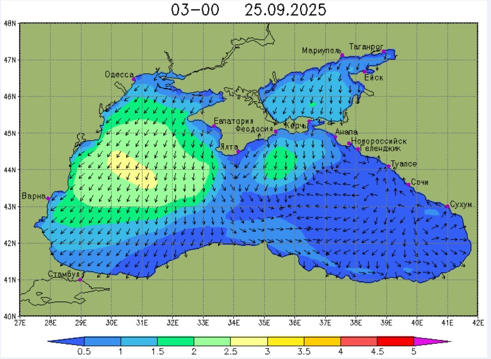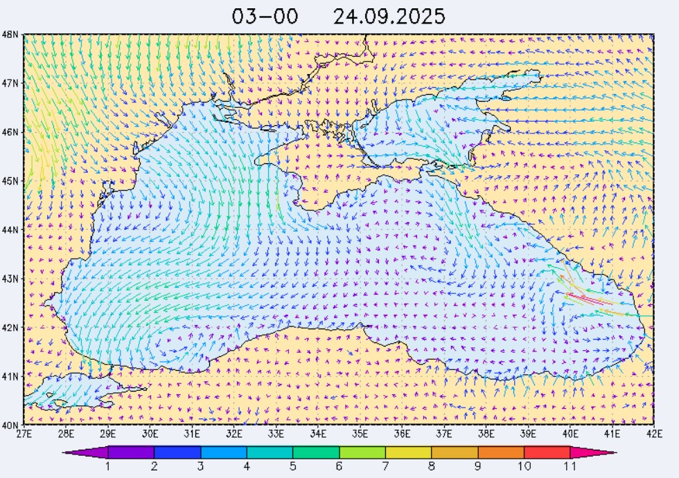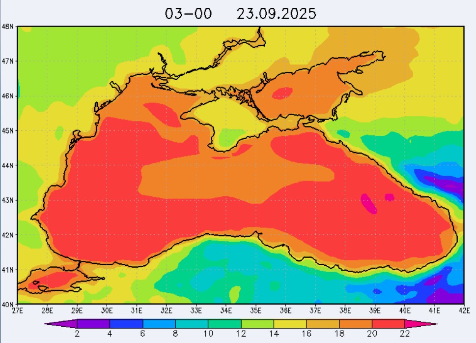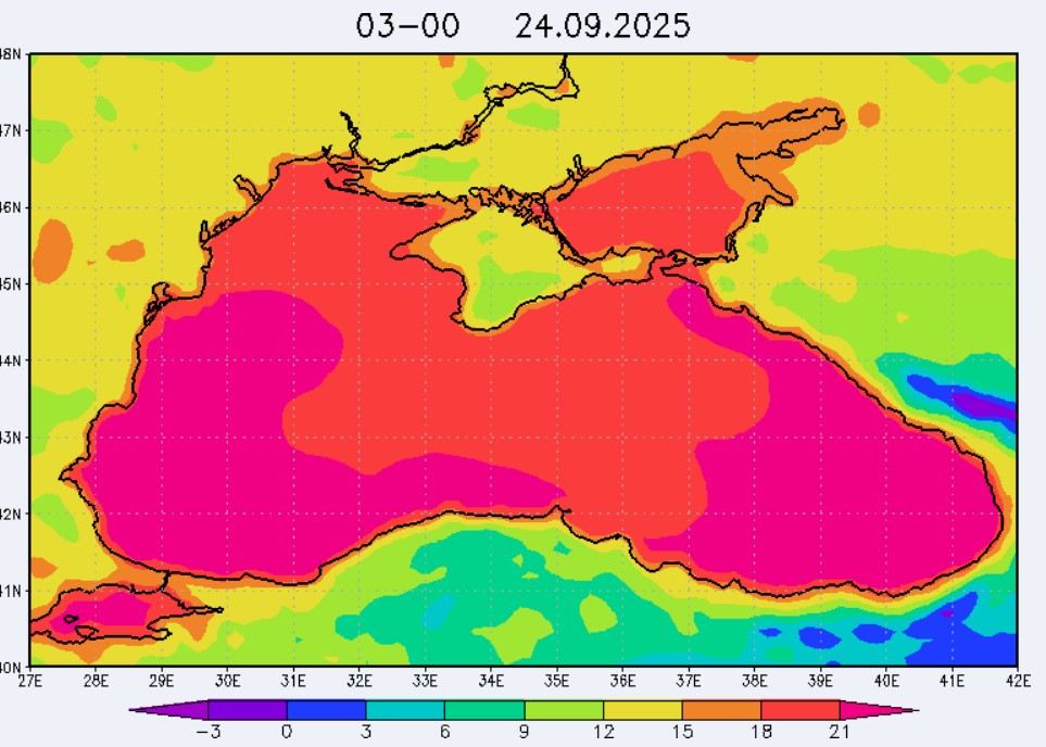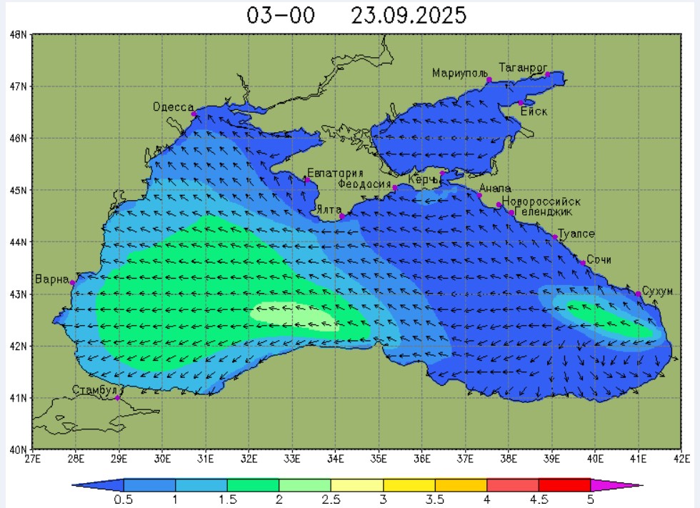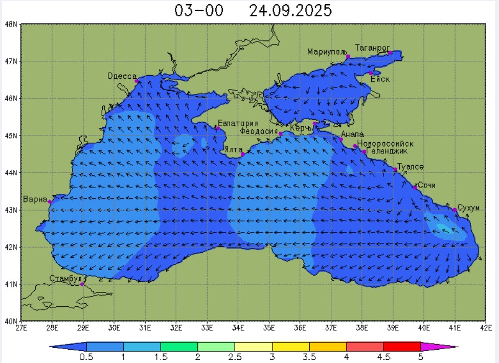 23 сентября у черноморских берегов Крыма и Краснодарского края, а также в Азовском море будут преобладать восточный и северо-восточный ветры скоростью 3-8 м/с, 24 сентября – северный и северо-западный ветры скоростью 3-7 м/с, 25 сентября – северо-восточный ветер скоростью 7-12 м/с. Средняя суточная температура воздуха в этих районах моря 23-25 сентября ожидается в пределах 19-21 °С. Температура поверхностных вод на черноморском шельфе Крыма и в Азовском море в эти дни составит 19-21 °С, у побережья Краснодарского края – 22-23 °С. С 24 по 6 сентября наиболее благоприятные для промысла шпрота океанографические условия будут формироваться у побережья Краснодарского края на участках шельфа от Анапы до пос. Бетта.Ветер