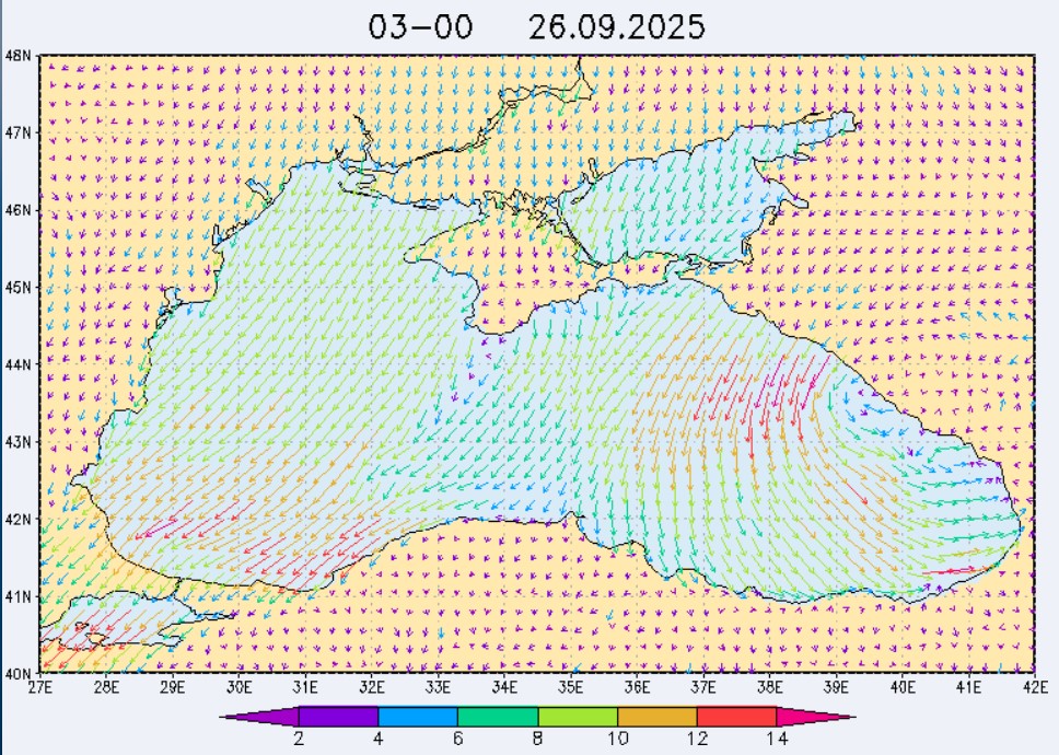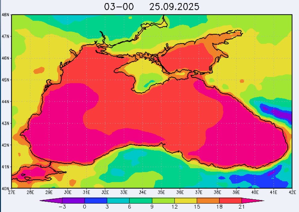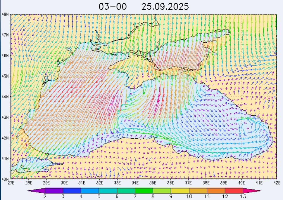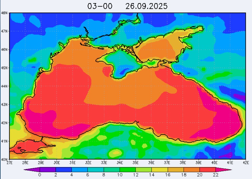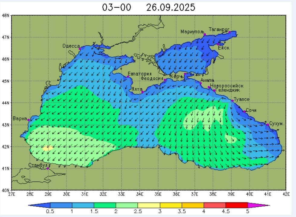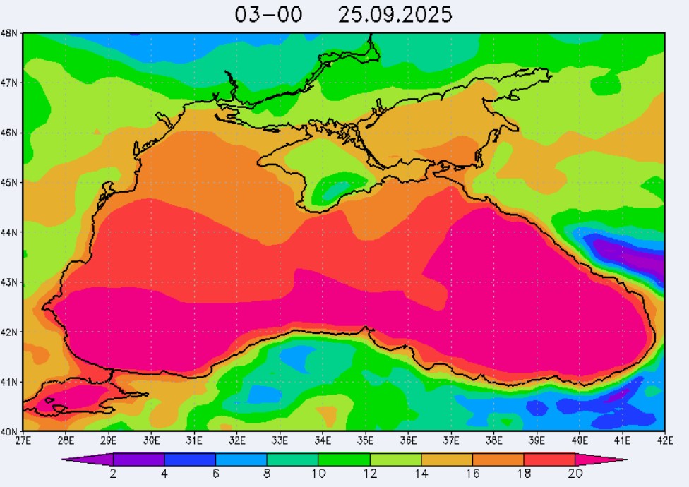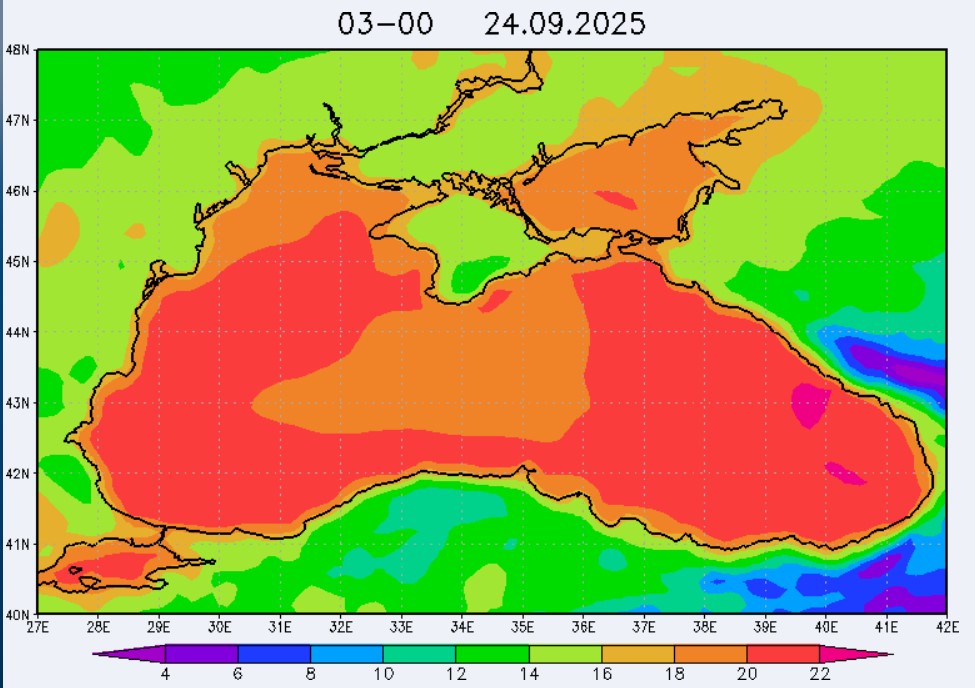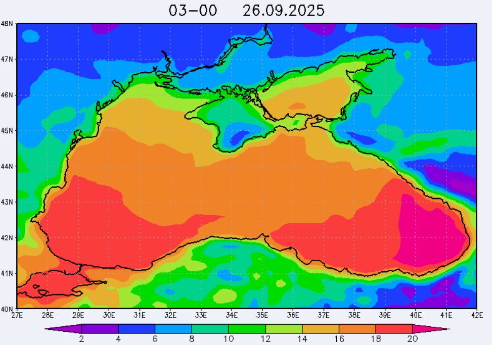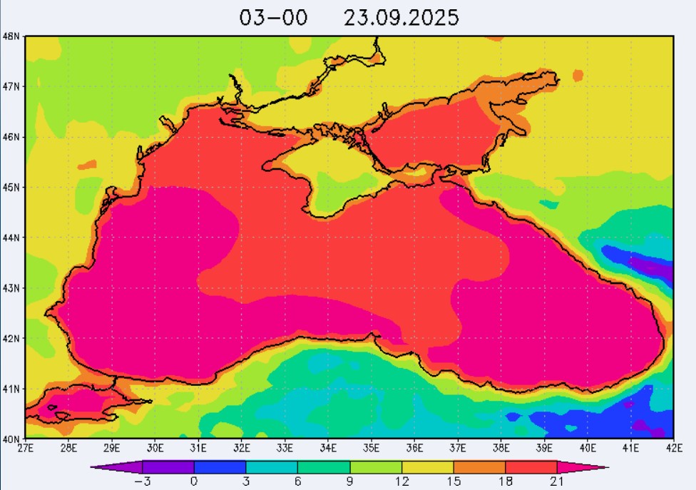 23 сентября у черноморских берегов Крыма и Краснодарского края, а также в Азовском море будут преобладать восточный и северо-восточный ветры скоростью 3-8 м/с, 24 сентября – северный и северо-западный ветры скоростью 3-7 м/с, 25 сентября – северо-восточный ветер скоростью 7-12 м/с. Средняя суточная температура воздуха в этих районах моря 23-25 сентября ожидается в пределах 19-21 °С. Температура поверхностных вод на черноморском шельфе Крыма и в Азовском море в эти дни составит 19-21 °С, у побережья Краснодарского края – 22-23 °С. С 24 по 6 сентября наиболее благоприятные для промысла шпрота океанографические условия будут формироваться у побережья Краснодарского края на участках шельфа от Анапы до пос. Бетта.Ветер