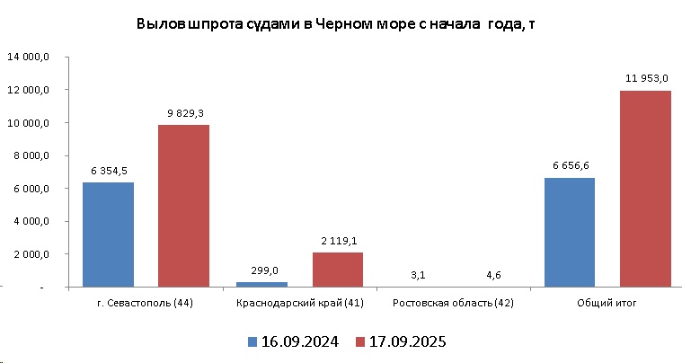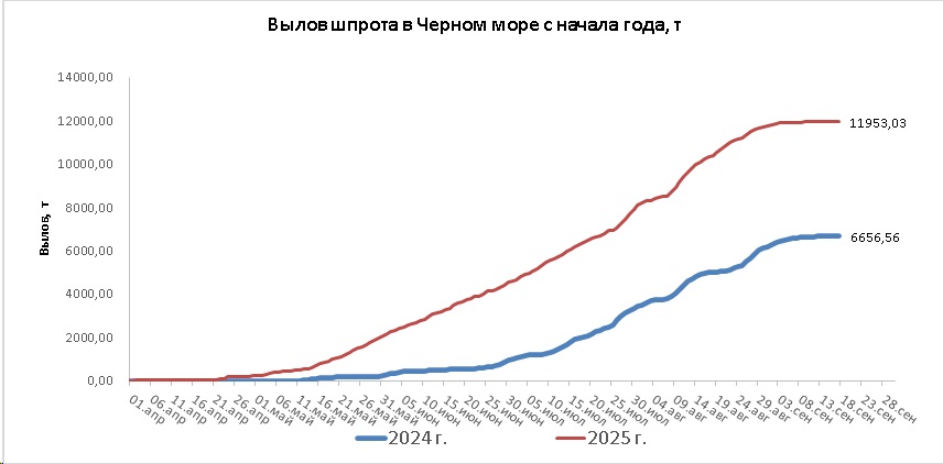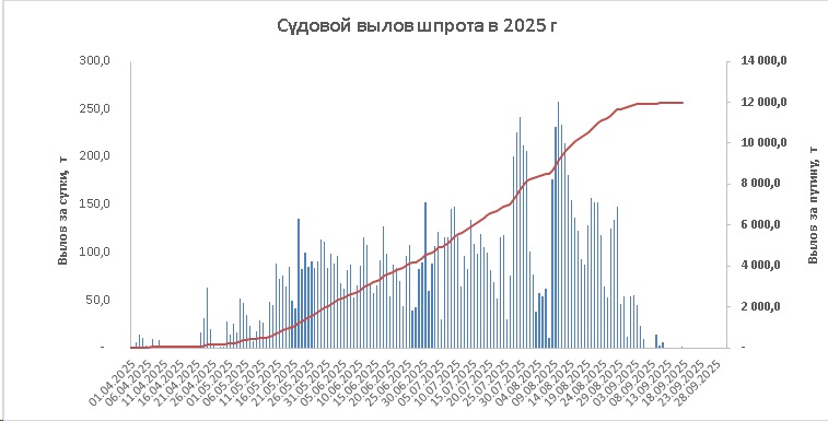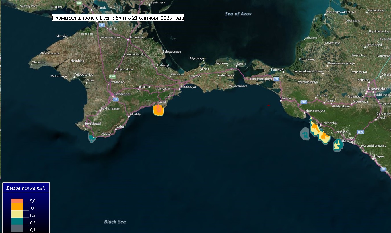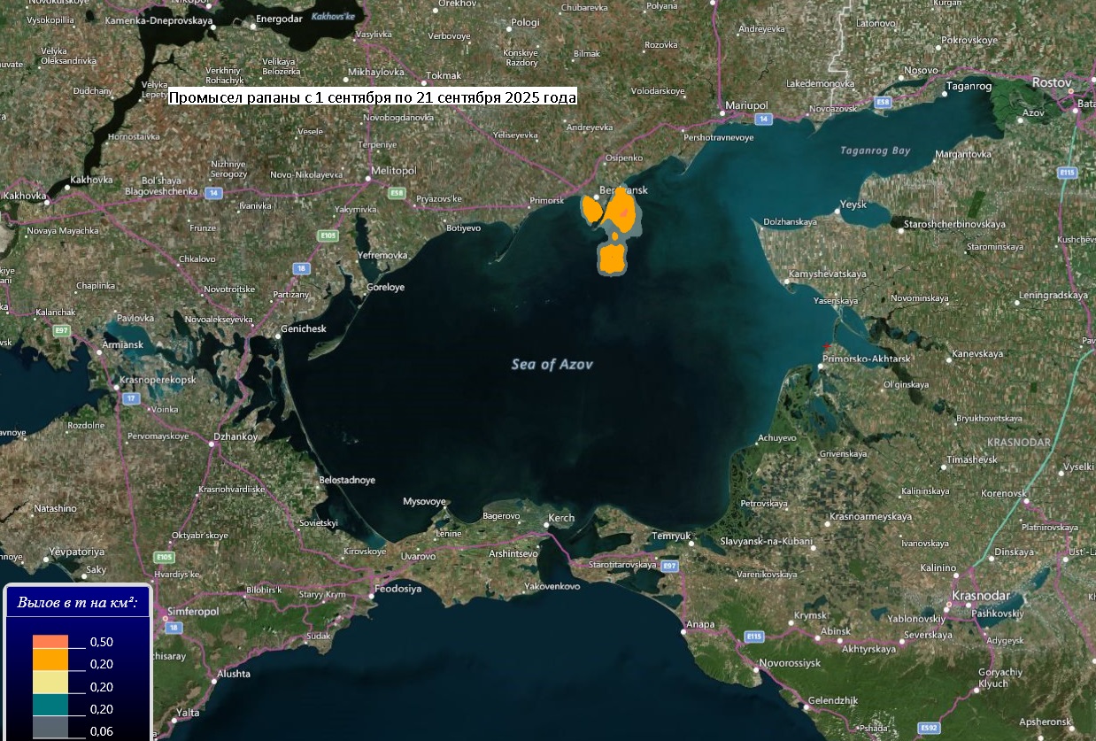 В период с 1 по 21 сентября 2025 года российские рыболовные суда вели в Черном море результативный промысел шпрота, в Азовском море – промысел рапаны.