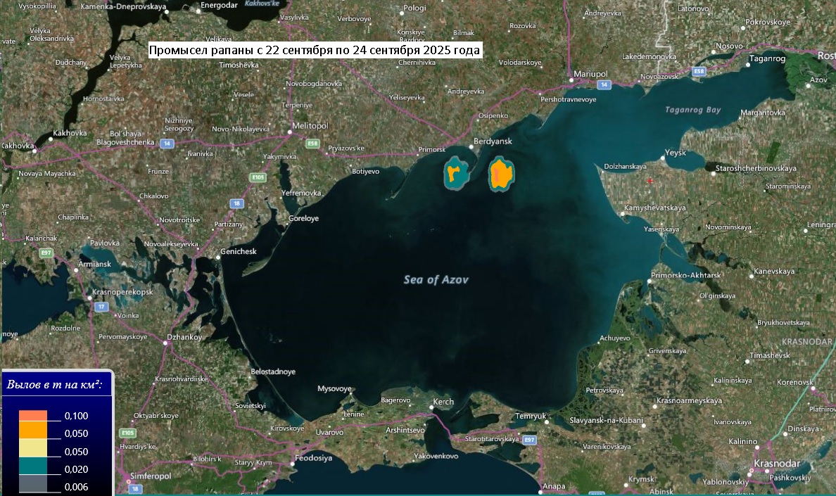 С 22 по 24 сентября 2025 года российские рыболовные суда вели в Азовском море промысел рапаны. Промысла шпрота в черном море не было.