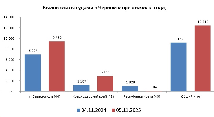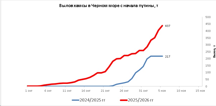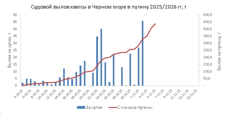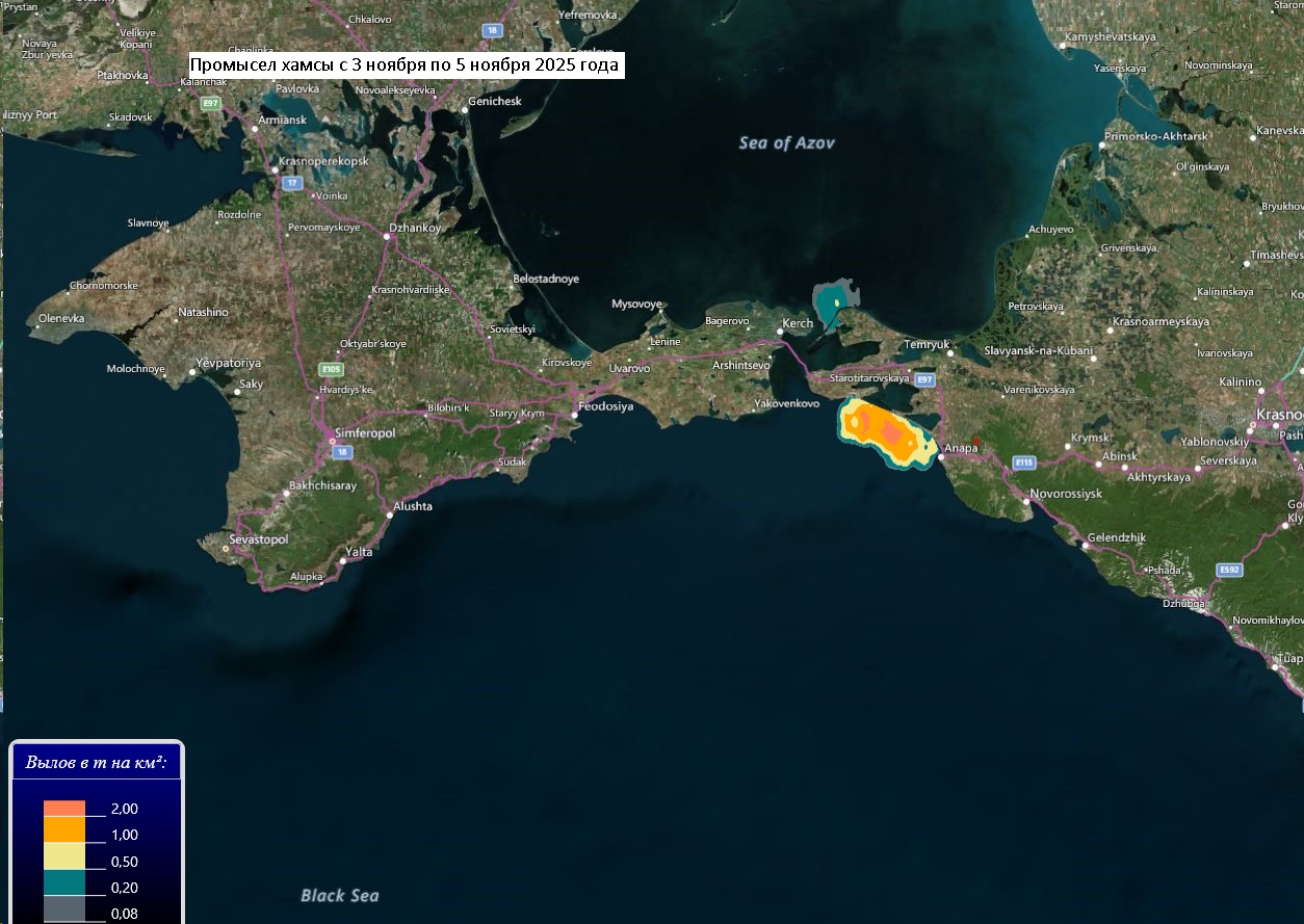 В период с 3 по 5 ноября 2025 года российские рыболовные суда вели в Азовском и Черном морях низко результативный промысел азовской хамсы.