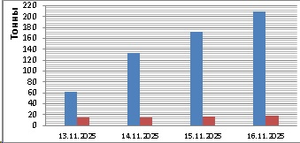 13 ноября в северо-восточной части Черного моря преобладали северный и северо-западный ветры скоростью 3-8 м/с, 14-16 ноября – северный и северо-восточный ветры скоростью 3-8 м/с 14 и 16 ноября и 5-10 м/с 15 ноября. Средняя суточная температура воздуха в этом районе 13-16 ноября находилась в пределах 11-13 °С. Температура поверхностных морских вод в прибрежных акваториях северо-восточной части Черного моря в эти дни составляла 14-16 °С. В период с 13 по 16 ноября основной промысел хамсы велся вдоль ЮБК среднетоннажными судами на участках шельфа от Алупки до пос. Орджоникидзе 13 и 14 ноября одним судном, 15 ноября – четырьмя и 16 ноября – пятью с суточным выловом от 4 т до 53 т (в среднем – 28,5 т) хамсы на одно судно. Общий вылов этой группы судов составил 313 т, из которых 78 т выловлены одним судном 15 и 16 ноября на участке шельфа от м. Меганом до пос. Орджоникидзе. 13-14 ноября два среднетоннажных судна вели промысел в предпроливной зоне на участке шельфа от пос. Яковенково до стан. Благовещенской с суточными уловами от 9 т до 39 т (в среднем – 20.0 т) на одно судно. 15 ноября одно среднетоннажное судно выловило 19,7 т хамсы у го-западного побережья на участке шельфа от м. Херсонес до м. Форос. Малотоннажные суда вели промысел хамсы на участке шельфа от м. Такиль до пос. Варваровка: 13 ноября – одним судном, 14-16 ноября – шестью-семью судами с суточными уловами от 2 т до 14 т (в среднем – 8,2 т) хамсы на одно судно. Общий вылов хамсы за период с 13 по 16 ноября составил 576 т. Данные об общем суточном вылове и средней суточной промысловой нагрузке одного судна представлены на рисунке.Прогноз промысла