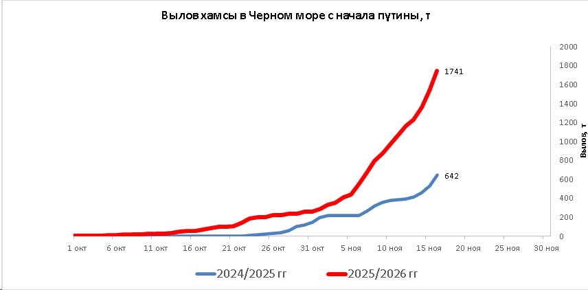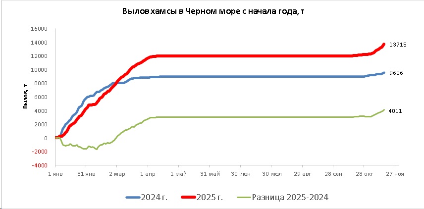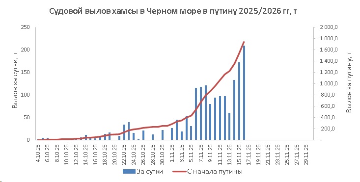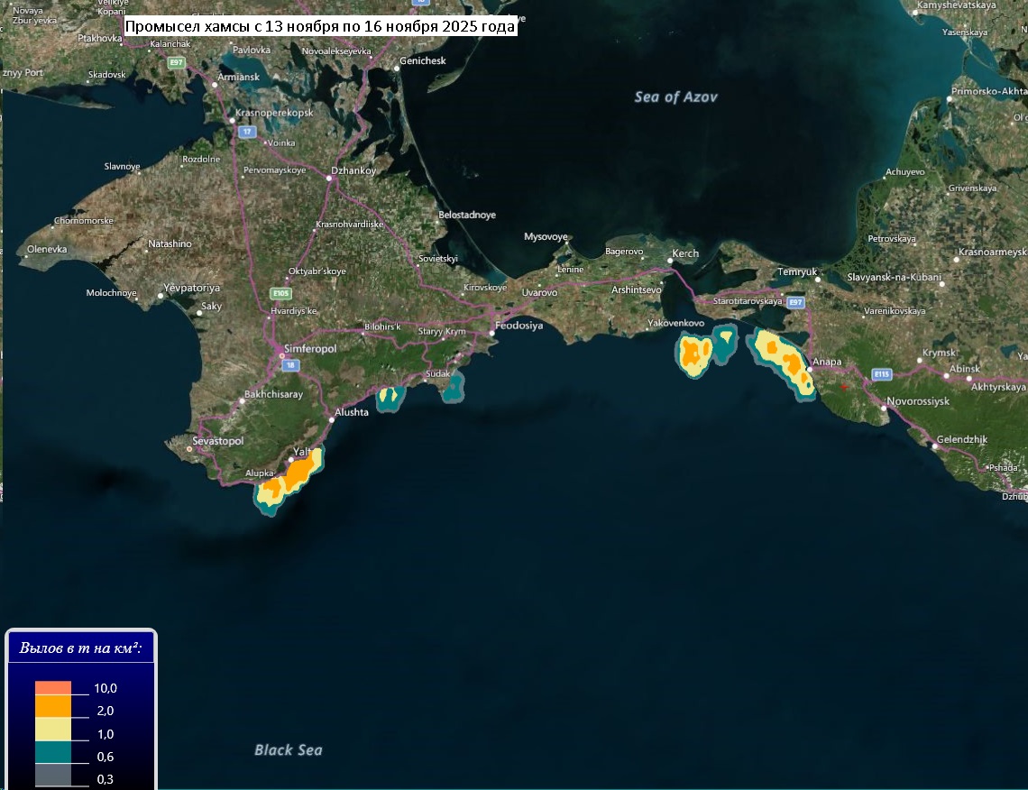 В период с 13 по 16 ноября 2025 года российские рыболовные суда вели в северо-восточной части Черного моря результативный промысел хамсы.