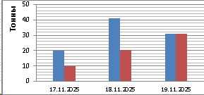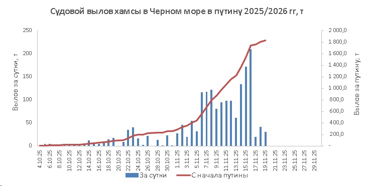 С 17 по 19 ноября в северо-восточной части Черного моря преобладали южный и юго-западный ветры скоростью 5-10 м/с 17 и 19 ноября и 10-15 м/с 18 ноября. Средняя суточная температура воздуха в этом районе 17-19 ноября находилась в пределах 13-16 °С. Температура поверхностных морских вод в прибрежных акваториях у берегов Крыма в эти дни составляла 14-15 °С, у побережья Краснодарского края – 15-16 °С. В период с 17 по 19 ноября промысел хамсы велся вдоль ЮБК в условиях сильных ветров южных румбов одним-двумя среднетоннажными судами на участках шельфа от Алупки до пос. Орджоникидзе (преимущественно от м. Меганом до пос. Орджоникидзе) с суточными уловами от 8 т до 34 т (в среднем – 18.4 т) хамсы на одно судно. Общий вылов хамсы за период с 17 по 19 ноября составил 92 т. Данные об общем суточном вылове и средней суточной промысловой нагрузке одного судна представлены на рисунке.Прогноз промысла