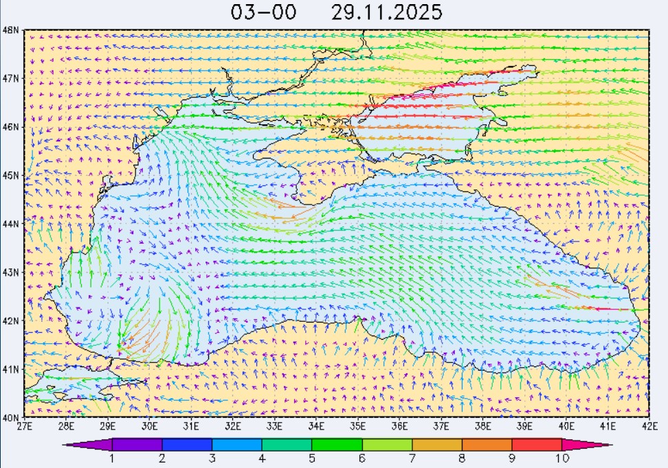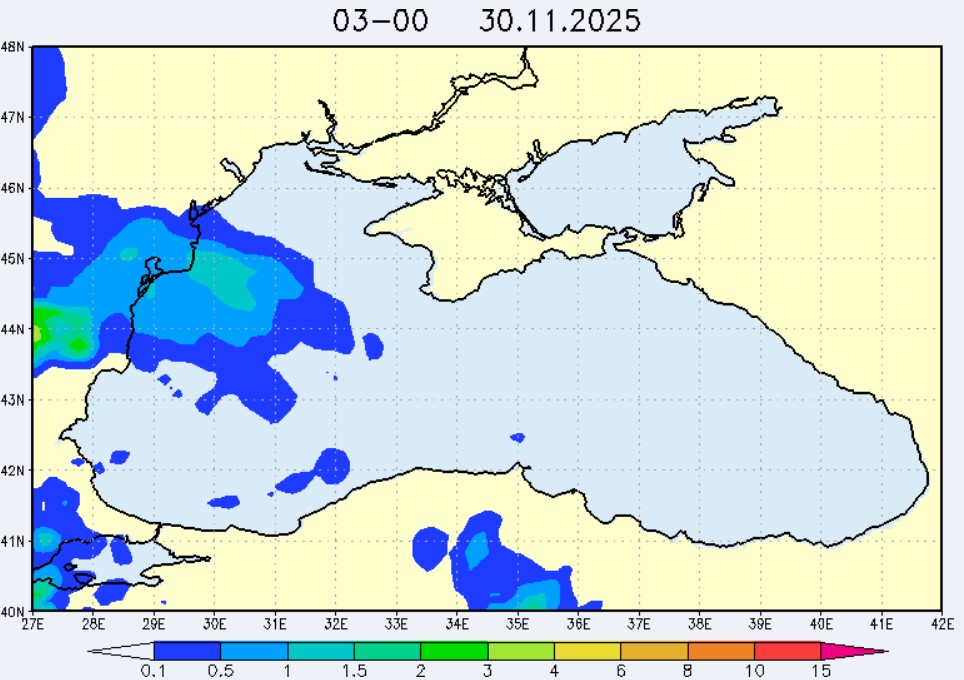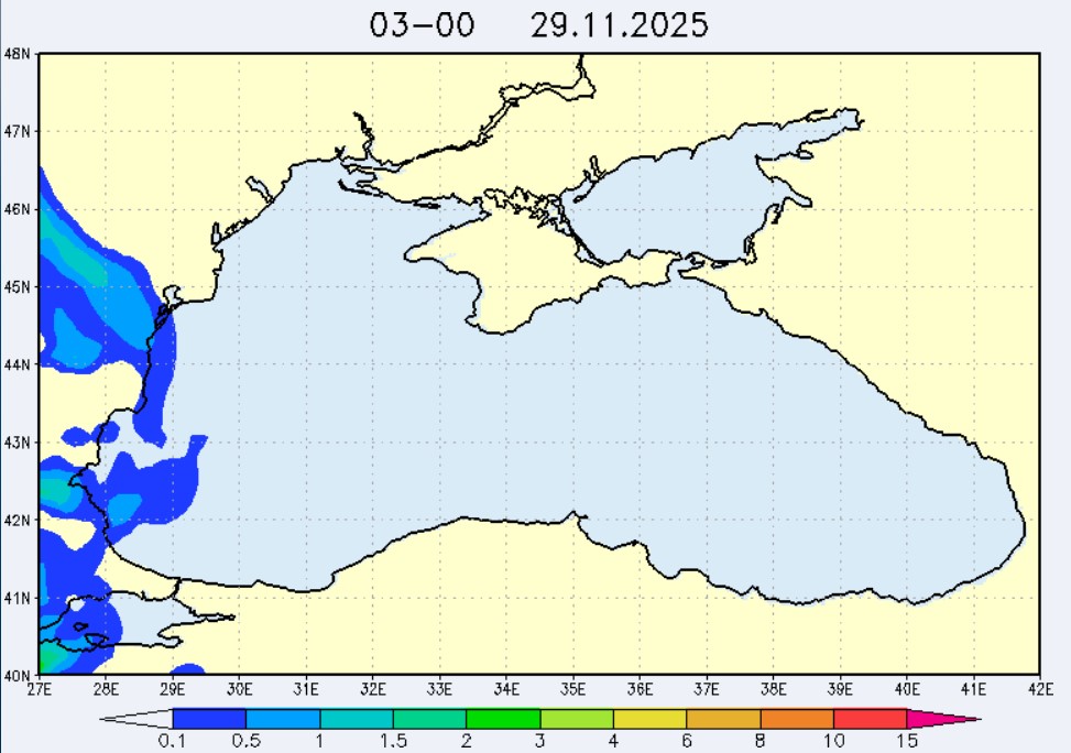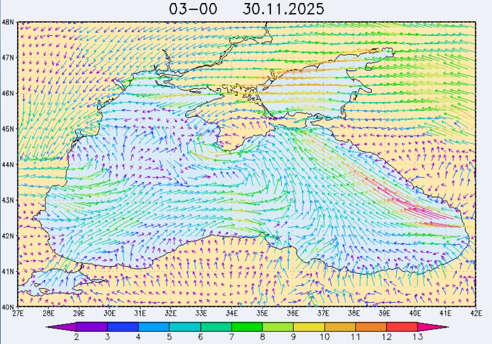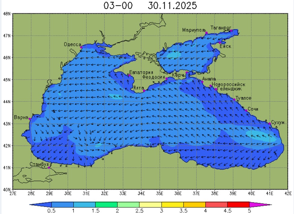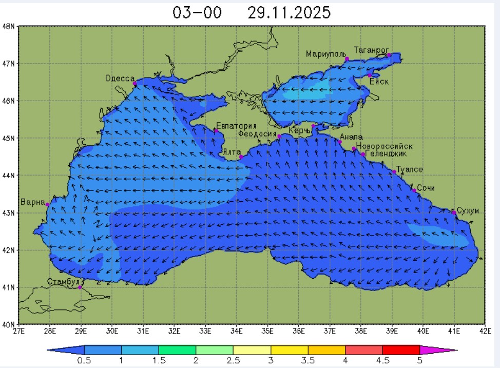 28-29 ноября в северо-восточной части Черного моря будут преобладать восточный и северо-восточный ветры скорость 3-6 м/с (в районе м. Сарыч – до 9 м/с), 30 ноября – 1 декабря - юго-восточный ветер скоростью 3-8 м/с. Средняя суточная температура воздуха в этом районе с 28 ноября по 1 декабря будет находиться в пределах 13-15 °С. Температура поверхностных морских вод в эти дни в прибрежных акваториях северо-восточной части Черного моря составит 14-16 °С. С 29 ноября по 2 декабря основной промысел хамсы будет продолжаться на неустойчивых мигрирующих скоплениях в северо-восточной части Черного моря на участках шельфа в районе м. Меганом и от м. Такиль до Анапы.Ветер
