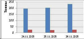24 ноября в северо-восточной части Черного моря, у берегов Крыма преобладали западный и северо-западный ветры скорость 3-8 м/с, у побережья Краснодарского края - юго-восточный ветер скоростью 3-8 м/с. 25 ноября по всему району наблюдались восточный и северо-восточный ветры скоростью 3-8 м/с, 26 ноября – юго-восточный ветер скоростью 3-8 м/с. Средняя суточная температура воздуха в этом районе моря 24-26 ноября находилась в пределах 12-15 °С. Температура поверхностных морских вод в прибрежных акваториях у берегов Крыма в эти дни составляла 14-15 °С, у побережья Краснодарского края – 15-16 °С. В период с 24 по 26 ноября основной промысел хамсы велся берегов Крыма на участке шельфа от Феодосийского залива до м. Такиль четырьмя среднетоннажными судами с суточными уловами от 21 т до 55 т (в среднем – 39,3 т) хамсы на одно судно. 25 и 26 ноября в Феодосийском заливе работало одно малотоннажное судно с суточными уловами, соответственно, 7,0 т и 11,1 т хамсы. У черноморского побережья Краснодарского края на участках шельфа от стан. Благовещенской до Анапы на промысле хамсы работало четыре малотоннажных судна с суточным выловом от 4 т до 18 т (средний – 12,1 т) хамсы на одно судно. Общий вылов хамсы за период с 24 по 26 ноября составил 635 т. Данные об общем суточном вылове и средней суточной промысловой нагрузке одного судна представлены на рисунке.Прогноз промысла