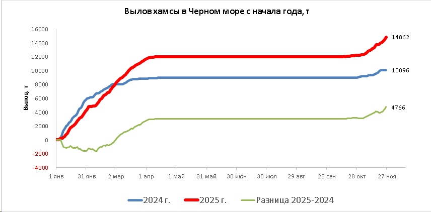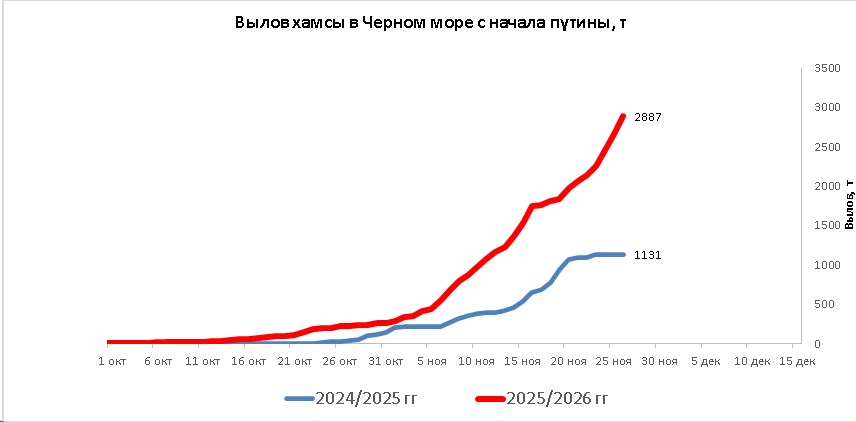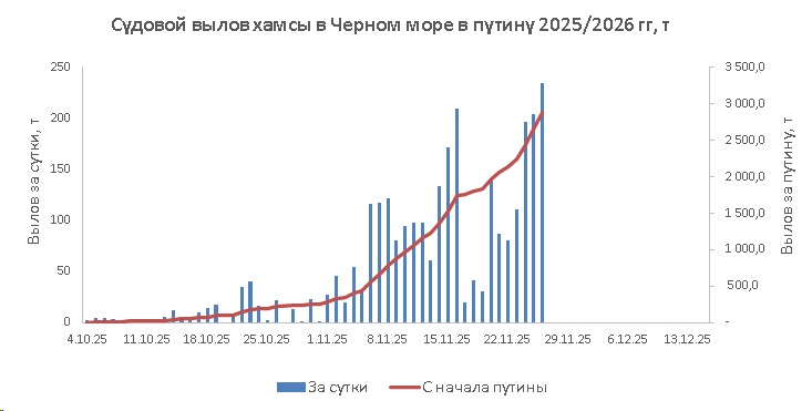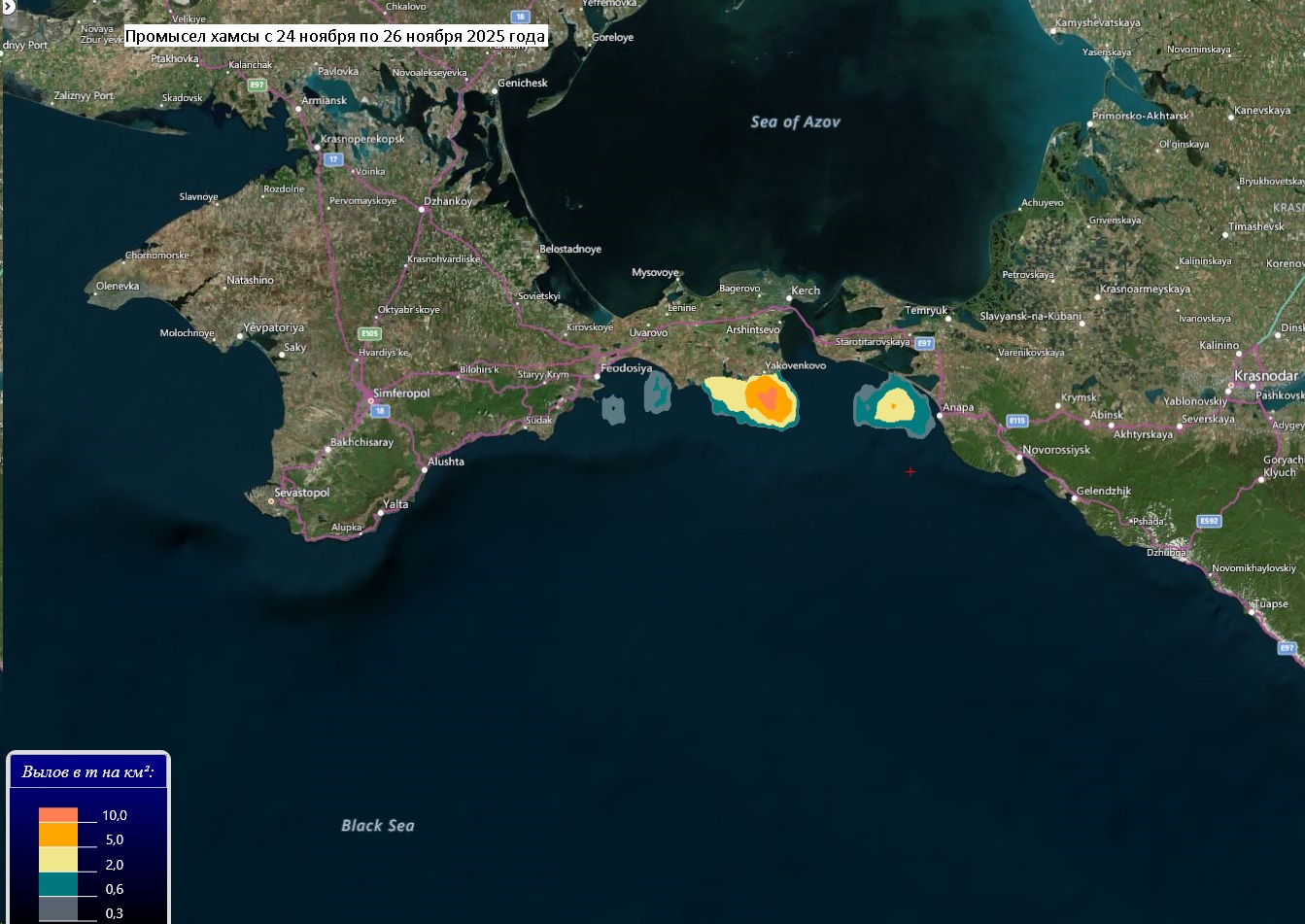 В период с 24 по 26 ноября 2025 года российские рыболовные суда вели в северо-восточной части Черного моря результативный промысел хамсы.
