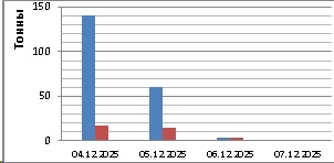 С 4 по 7 декабря в северо-восточной части Черного моря преобладали восточный и северо-восточный ветры: 4 декабря скоростью 3-8 м/с, 5 декабря – 7-12 м/с, 6 и 7 декабря – 10-15 м/с. Средняя суточная температура воздуха в этом районе моря 4-7 декабря находилась в пределах 9-14°С. Температура поверхностных морских вод в прибрежных акваториях у черноморских берегов Крыма и Краснодарского края составляла 13-15 °С. 4 и 5 декабря промысел хамсы на участке шельфа от Керченского пролива до стан. Благовещенская велся двумя-тремя среднетоннажными судами с суточным выловом от 12 т до 19 т (в среднем – 17,1 т) хамсы на одно судно. В районе Феодосийского залива одно среднетоннажное судно выловило, соответственно, 39,1 т и 21,1 т хамсы. На участке шельфа от стан. Благовещенская до Анапы 4 декабря на промысле хамсы работало четыре малотоннажных судна, 5 декабря - одно с суточными уловами от 4 т до 19 т (средний – 11.2 т) хамсы на одно судно. 6 декабря на участке шельфа в районе Анапы одно малотоннажное судно выловило 4,0 т хамсы, 7 декабря – 0,1 т хамсы и 0,5 т ставриды. Общий вылов хамсы за период с 4 по 7 декабря составил 206 т. Данные об общем суточном вылове и средней суточной промысловой нагрузке одного судна представлены на рисунке.Прогноз промысла