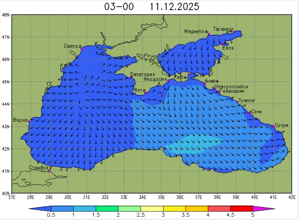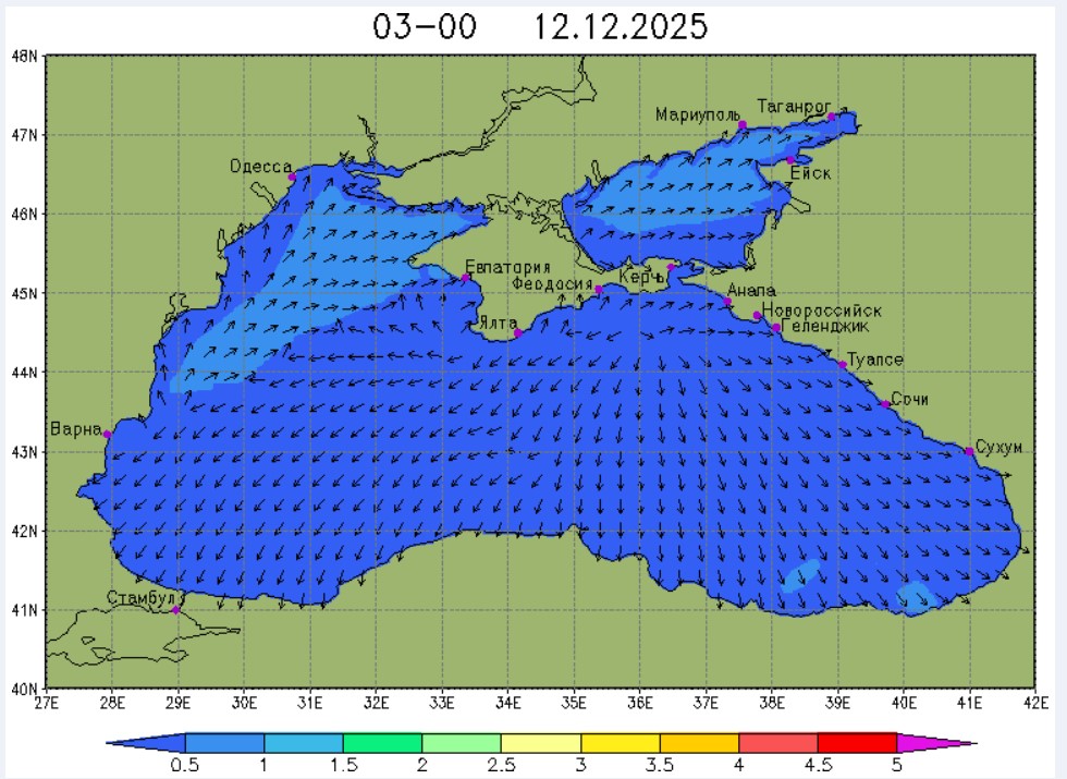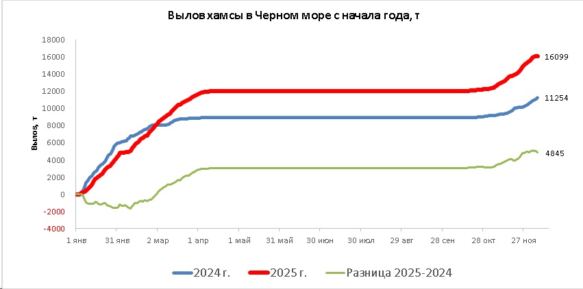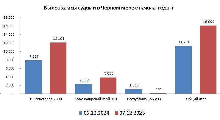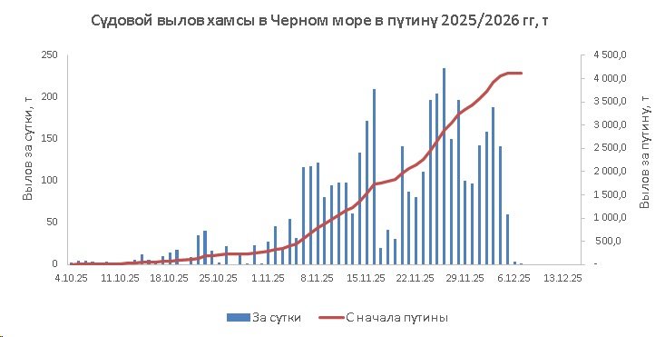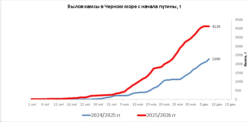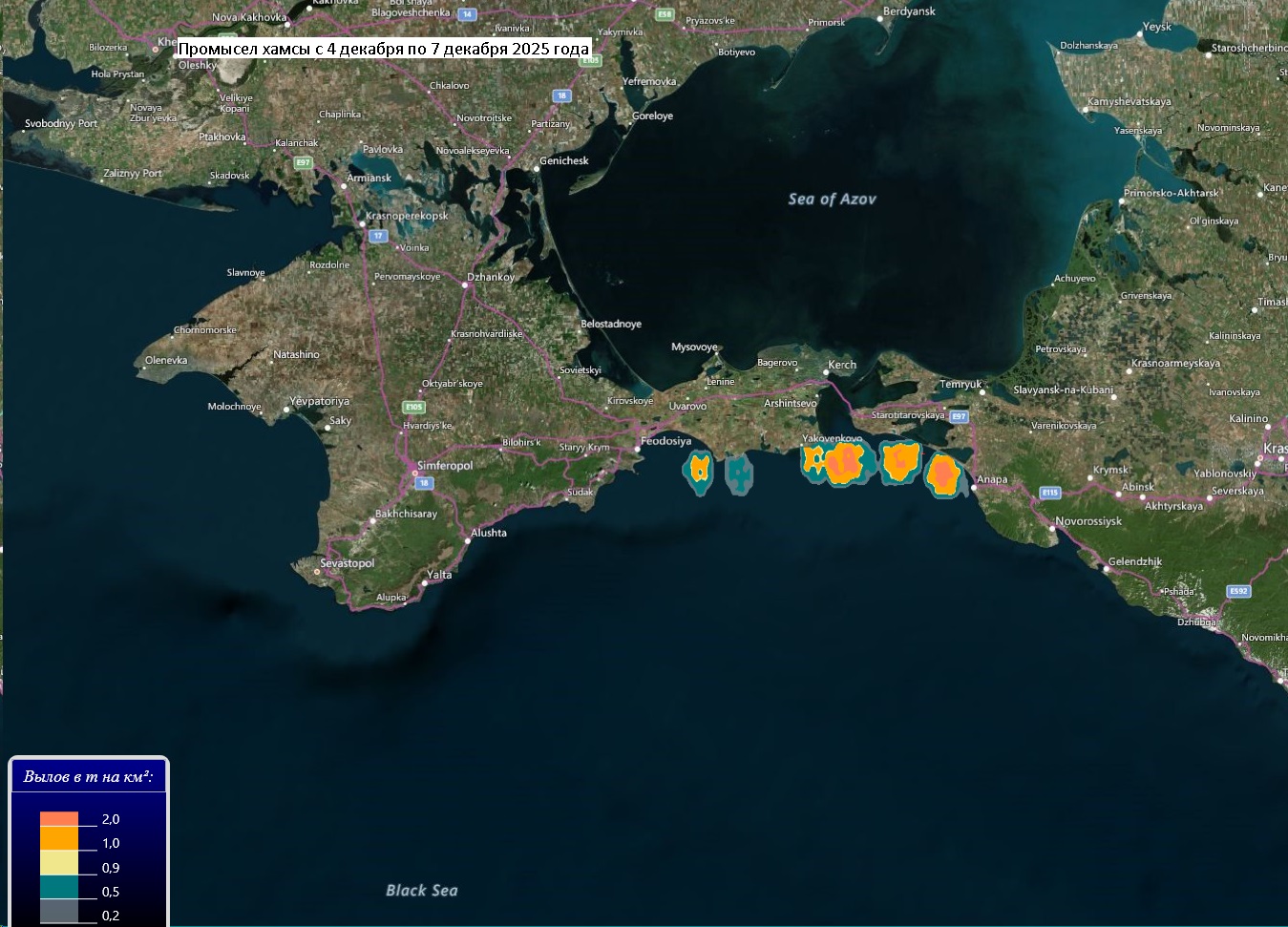 В период с 4 по 7 декабря 2025 года российские рыболовные суда вели в северо-восточной части Черного моря неустойчивый промысел хамсы.