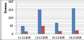 11 декабря в северо-восточной части Черного моря преобладал северо-восточный ветер скоростью 3-8 м/с, 12 декабря – западный и юго-западный ветры скоростью 3-8 м/с, 13 декабря - северо-западный ветер скорость 9-14 м/с, 14 декабря - северный и северо-восточный ветры скоростью 3-8 м/с. Средняя суточная температура воздуха в этом районе моря уменьшалась с 8-11 °С 11 декабря до 4-7 °С 14 декабря. Температура поверхностных морских вод в прибрежных акваториях у черноморских берегов Крыма и Краснодарского края составляла 13-14 °С. 11-12 декабря промысел хамсы велся тремя среднетоннажными судами на протяженном участке шельфа от пос. Рыбачье до м. Чауда, 13-14 декабря – двумя-тремя среднетоннажными судами от оз. Узунларское до пос. Яковенково с суточным выловом от 12 т до 65 т (в среднем – 30,6 т) хамсы на одно судно. На участке шельфа от пос. Волна до Анапы 13 декабря промысел хамсы вело одно малотоннажное судно, 14 декабря – пять малотоннажных судов с уточными уловами от 3 т до 28 т (средний – 16,2 т) хамсы на одно судно. Общий вылов хамсы за период с 11 по 14 декабря составил 434 т. Данные об общем суточном вылове и средней суточной промысловой нагрузке одного судна представлены на рисунке.Прогноз промысла