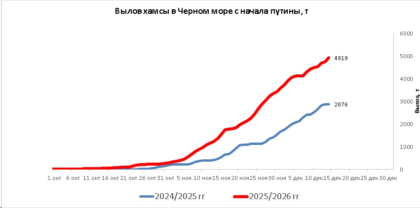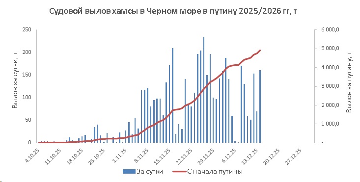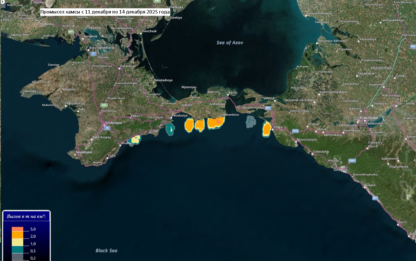 В период с 11 по 14 декабря 2025 года российские рыболовные суда вели в северо-восточной части Черного моря неустойчивый, но в целом результативный промысел хамсы.