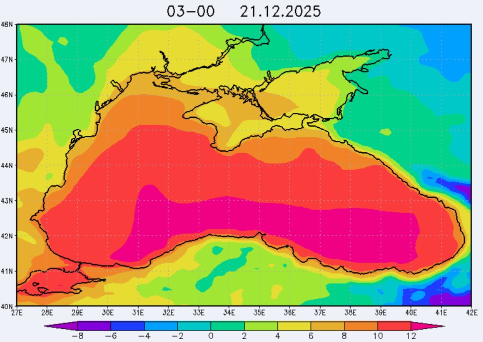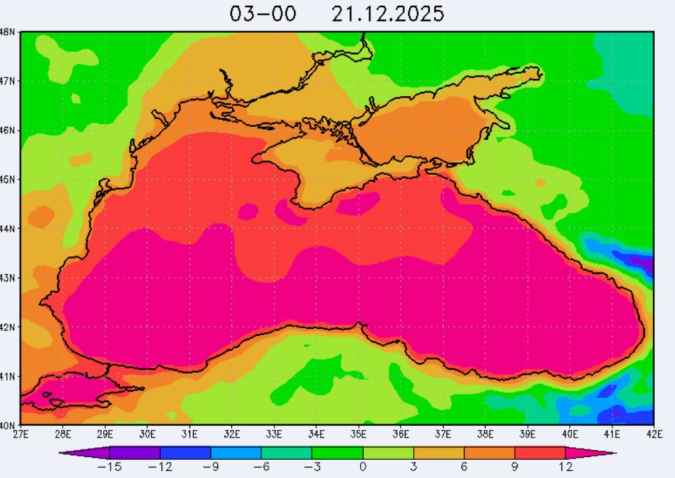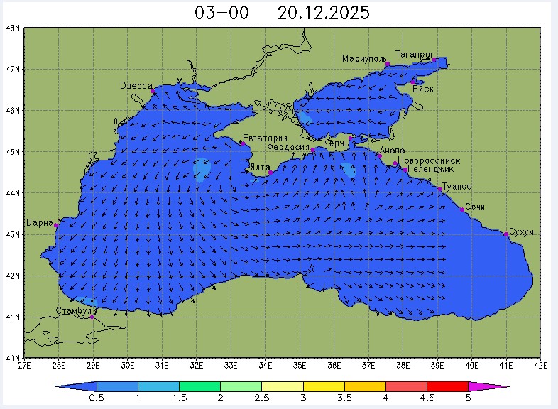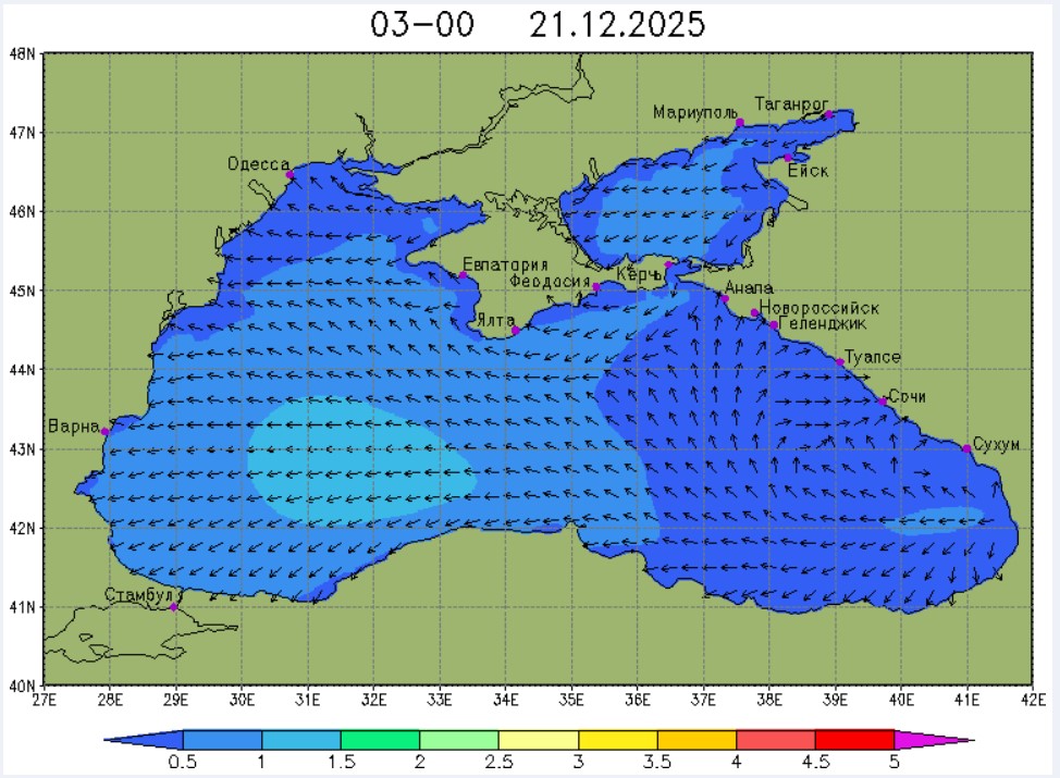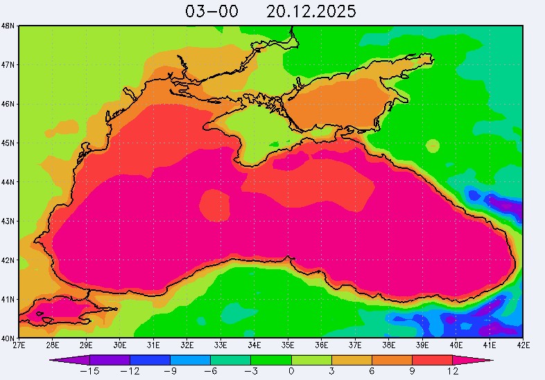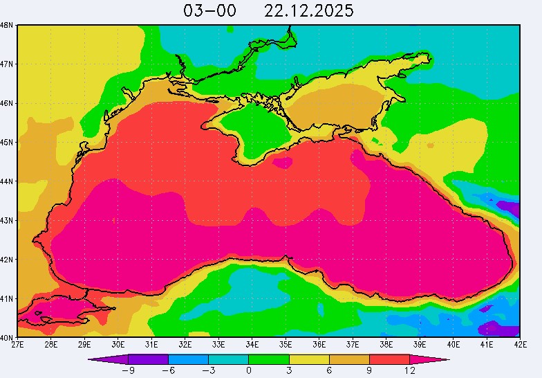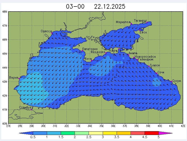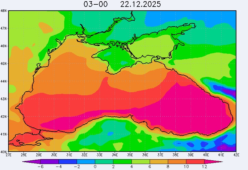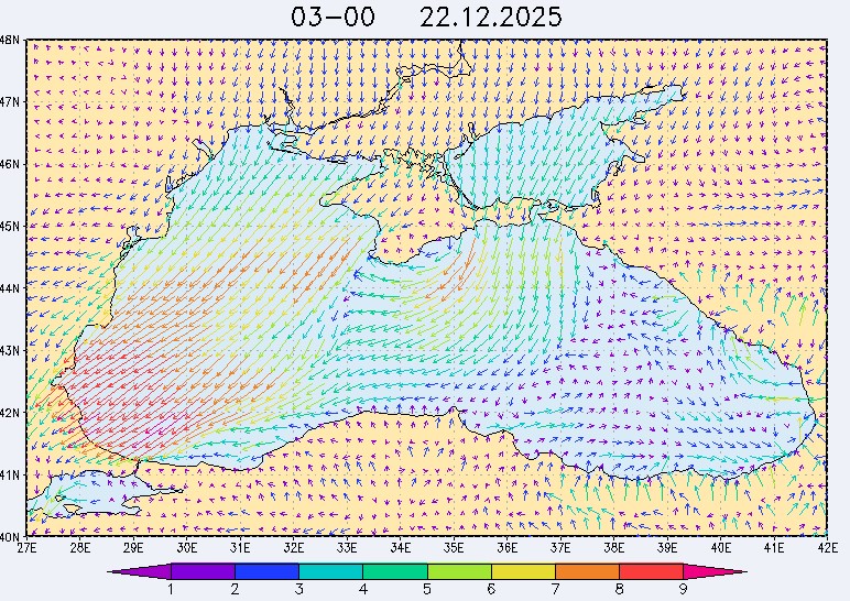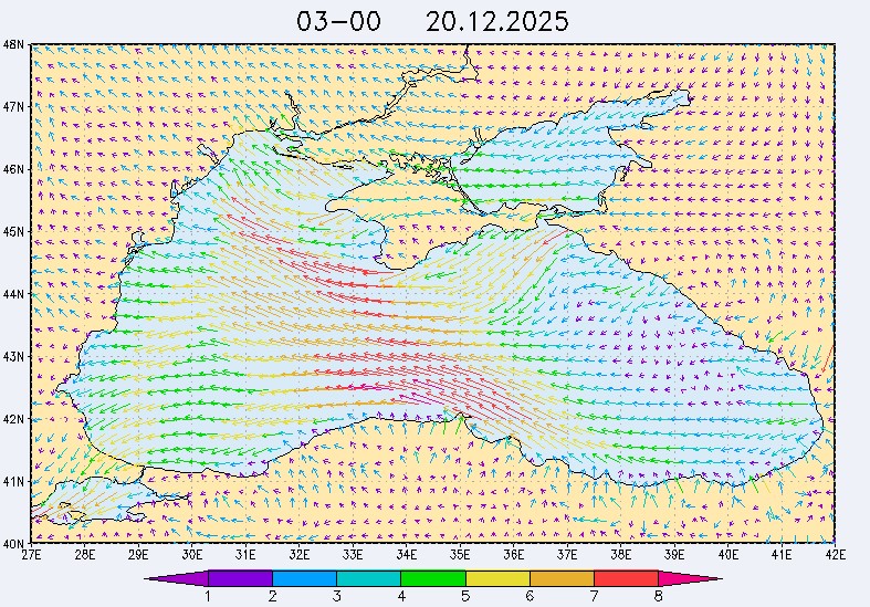 19 и 22 декабря в северо-восточной части Черного моря будут преобладать слабые ветры переменных направлений, а 20 и 21 декабря – северо-восточный ветер скоростью 3-8 м/с. Средняя суточная температура воздуха в этом районе моря с 19 по 22 декабря будет находиться в пределах 9-11 °С. Температура поверхностных морских вод в эти дни в прибрежных акваториях северо-восточной части Черного моря составит 12-14 °С. С 20 по 23 декабря наиболее результативный промысел хамсы в северо-восточной части Черного моря может проводиться на неустойчивых скоплениях, на участках шельфа у м. Херсонес, у Алушты, у Анапы и у пос. Архипо-Осиповка.Ветер