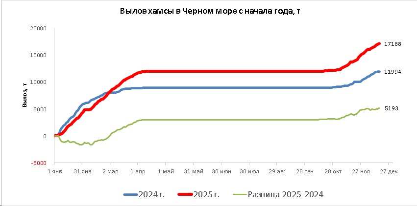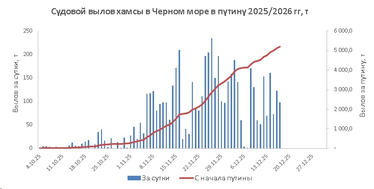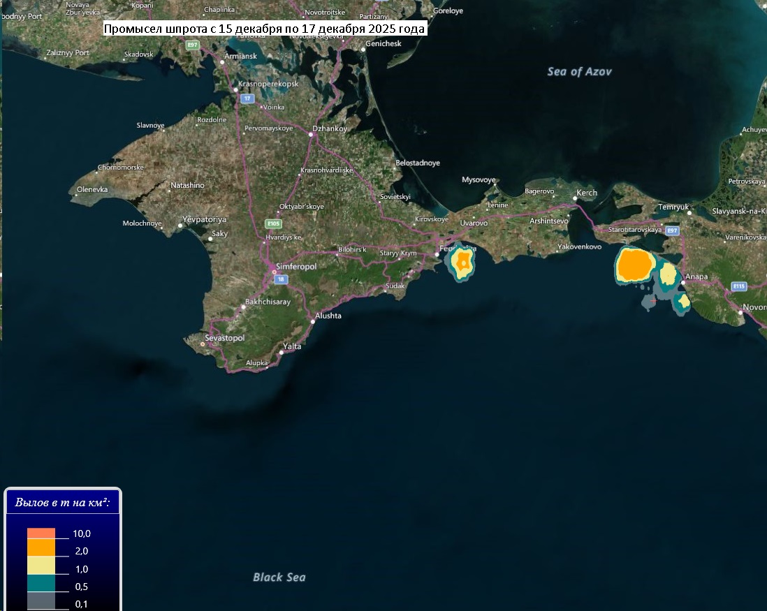 В период с 15 по 17 декабря 2025 года российские рыболовные суда вели в северо-восточной части Черного моря неустойчивый промысел хамсы.