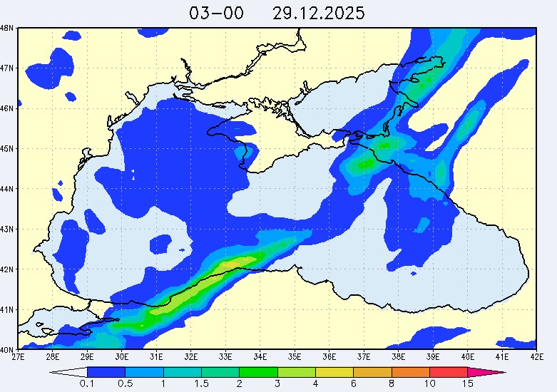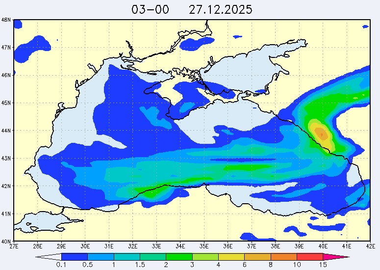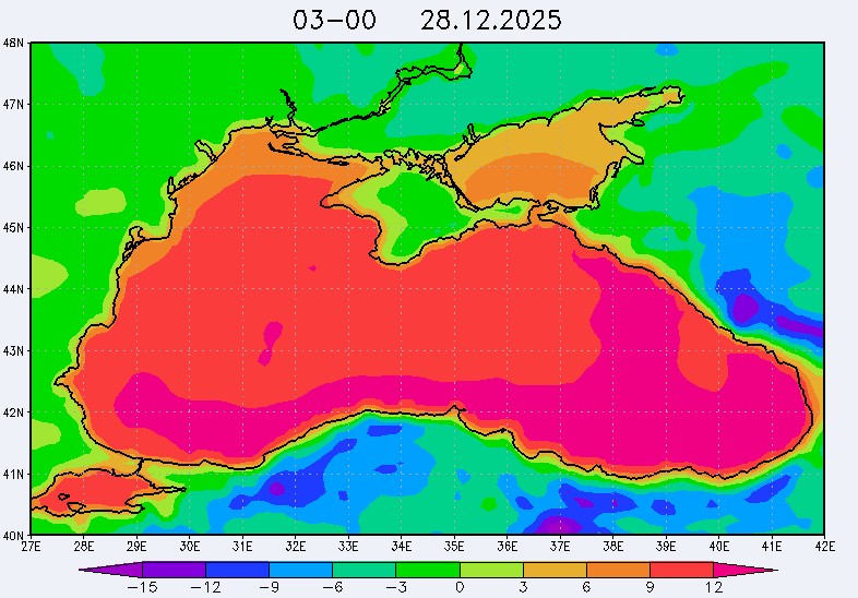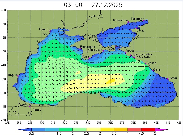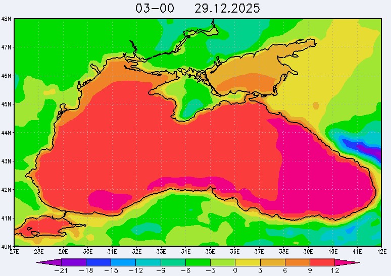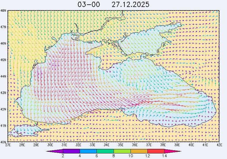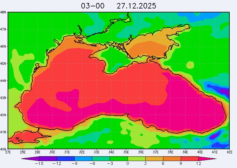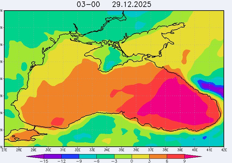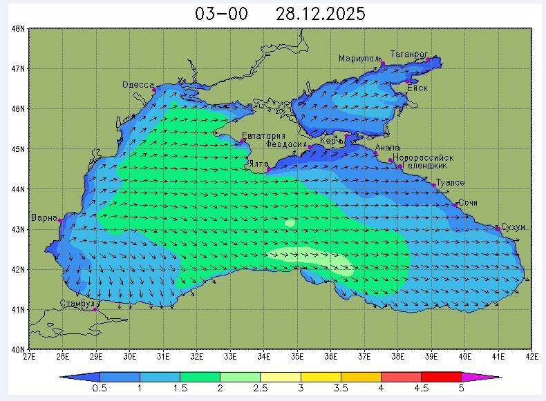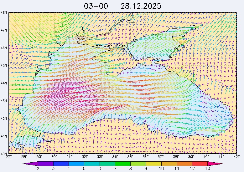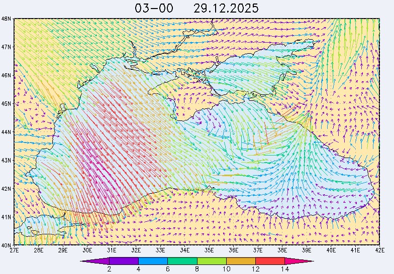 26 и 27 декабря в северо-восточной части Черного моря будет преобладать северо-западный ветер скоростью, соответственно, 3-8 м/с и 6-11 м/с, 28 декабря – юго-западный ветер скорость 8-13 м/с и 29 декабря – западный и северо-западный ветры скорость 10-15 м/с. Средняя суточная температура воздуха в этом районе моря будет увеличиваться от 2-4 °С 26 декабря до 5-7 °С 29 декабря. Температура поверхностных морских вод в эти дни в прибрежных акваториях северо-восточной части Черного моря составит 10-13 °С. С 27 по 30 декабря наиболее результативный промысел хамсы в северо-восточной части Черного моря может проводиться на неустойчивых скоплениях, на участках шельфа у м. Херсонес, у Алушты, у м. Такиль, у Новороссийска и у Туапсе.Ветер