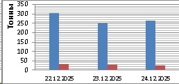 С 22 по 24 декабря в северо-восточной части Черного моря преобладали северный и северо-восточный ветры скоростью 3-8 м/с. Средняя суточная температура воздуха в этом районе моря уменьшалась с 8-11 °С 22 декабря до 7-9 °С 24 декабря. Температура поверхностных морских вод в прибрежных акваториях у черноморских берегов Крыма и Краснодарского края в эти дни составляла 11-13 °С. Основной промысел хамсы 22-24 декабря велся четырьмя-пятью среднетоннажными судами на участке шельфа южнее Керченского пролива с суточными уловами от 31 т до 60 т (в среднем – 49,5 т) хамсы на одно судно. На участке шельфа от Анапы до пос. Мысхако промысел хамсы вело три-четыре малотоннажных судна с суточными уловами от 0,8 т до 16 т (средний – 9,0 т) хамсы на одно судно. На участке шельфа от м. Меганом до пос. Орджоникидзе одно малотоннажное судно 22-24 декабря выловило, соответственно, 13,3 т, 8,8 т и 4,5 т хамсы. Общий вылов хамсы за период с 22 по 24 декабря составил 819 т. Данные об общем суточном вылове и средней суточной промысловой нагрузке одного судна представлены на рисунке.Прогноз промысла