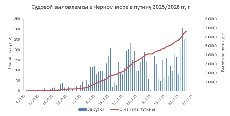 В период с 22 по 24 декабря 2025 года российские рыболовные суда вели в северо-восточной части Черного моря неустойчивый, но результативный промысел хамсы.