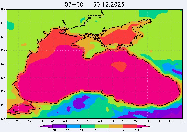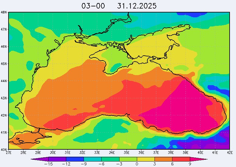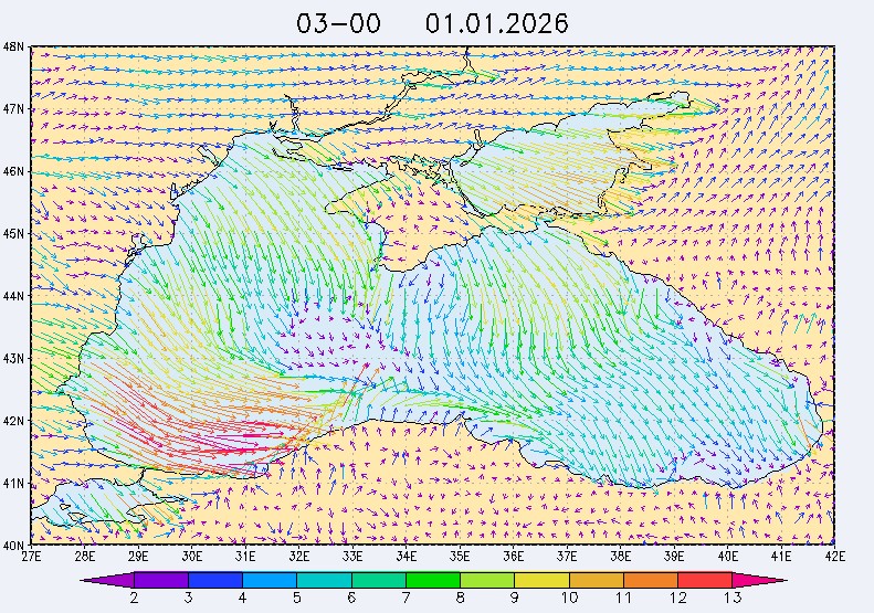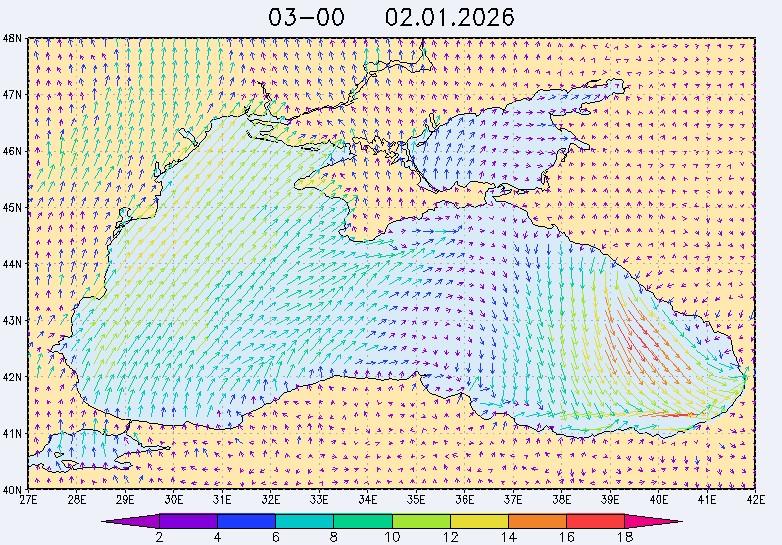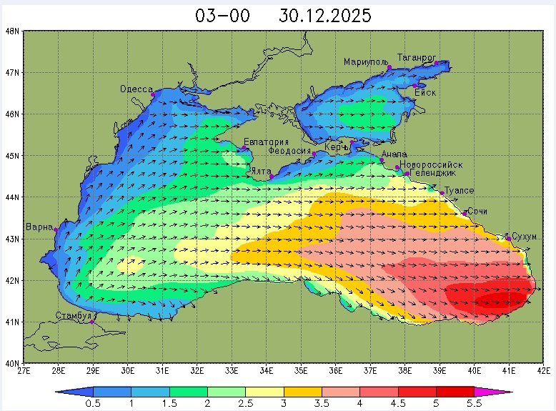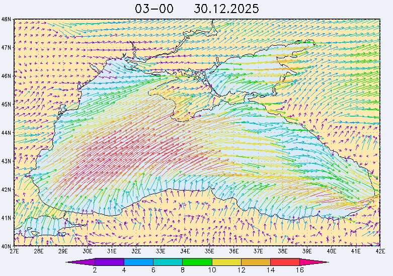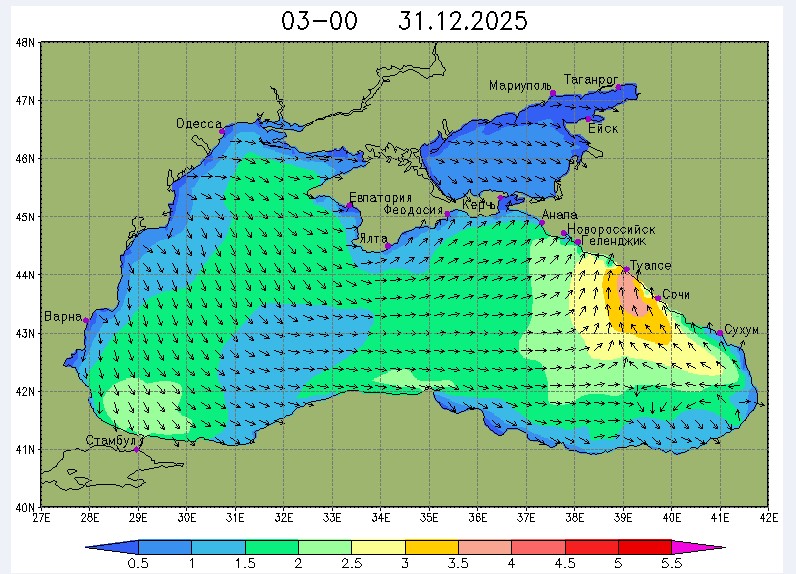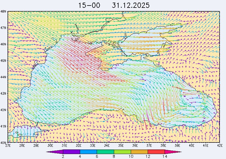30 декабря в северо-восточной части Черного моря будут преобладать западный и юго-западный ветры 7-12 м/с, 31 декабря и 1 января – северо-западный ветер скорость 8-13 м/с и 29 декабря – западный и северо-западный ветры скорость 5-10 м/с. Средняя суточная температура воздуха в этом районе моря будет уменьшаться от 4-7 °С 30 декабря до 1-3 °С 1 января. Температура поверхностных морских вод в эти дни в прибрежных акваториях северо-восточной части Черного моря составит 10-11 °С. С 31 декабря по 2 января наиболее результативный промысел хамсы на неустойчивых скоплениях в северо-восточной части Черного моря может проводиться, на участках шельфа у м. Сарыч, у Анапы и у Туапсе.Ветер