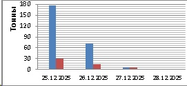 25 декабря в северо-восточной части Черного моря и в Азовском море преобладал северо-восточный ветер скоростью 8-13 м/с, 26 и 27 декабря – северо-западный ветер скоростью 6-11 м/с, 28 декабря – западный и юго-западный ветры скоростью 7-12 м/с. Средняя суточная температура воздуха в этом районе Черного моря 25-28 декабря находилась в пределах 2-6 °С, в Азовском море - -2-+2 °С. Температура поверхностных морских вод в прибрежных акваториях у черноморских берегов Крыма и Краснодарского края в эти дни составляла 10-12 °С, в Азовском море (без Таганрогского залива) – 4-7 °С. Основной промысел хамсы велся 25 декабря пятью и 26 декабря – двумя среднетоннажными судами на участке шельфа от м. Чауда до пос. Волна с суточными уловами от 10 т до 51 т (в среднем – 30,8 т) хамсы на одно судно. На этом же участке шельфа 26 декабря одно малотоннажное судно выловило 2,8 т хамсы. На участке шельфа от Судака до пос. Курортное одно малотоннажное судно с 25 по 27 декабря выловило за сутки, соответственно, 9,7 т, 13,4 т и 5,6 т хамсы. А в районе Анапы одно малотоннажное судно выловило 26 декабря 7,8 т хамсы. В Азовском море в районе Бердянской косы одно малотоннажное судно 27 декабря выловило 16,2 т тюльки. 28 декабря промысла в Черном и Азовском морях не было. Общий вылов хамсы за период с 25 по 28 декабря составил 254 т. Данные об общем суточном вылове и средней суточной промысловой нагрузке одного судна представлены на рисунке.Прогноз промысла
