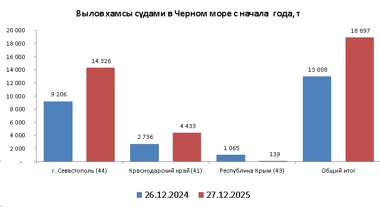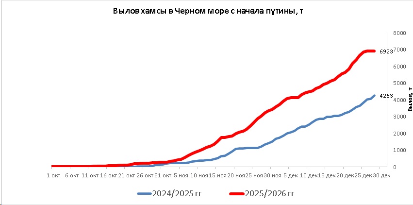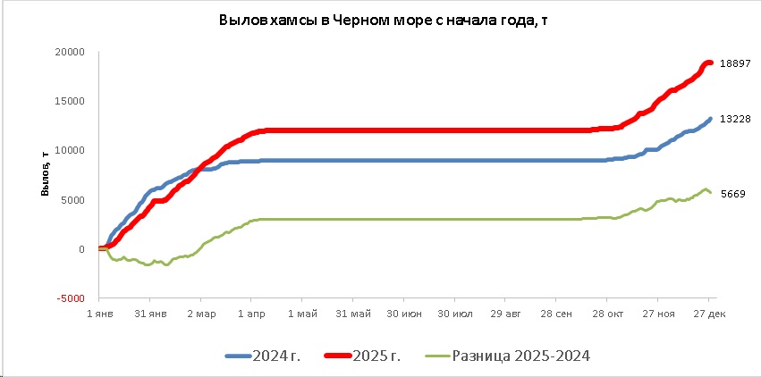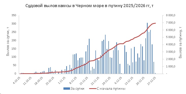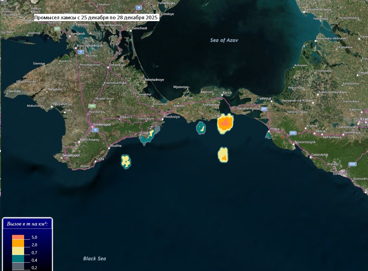 В период с 25 по 28 декабря 2025 года российские рыболовные суда вели в северо-восточной части Черного моря неустойчивый промысел хамсы, в Азовском море - тюльки.