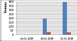19 и 20 января 2026 года в северо-восточной части Черного моря преобладал северо-восточный ветер: 19 января скоростью 11-16 м/с; 20 января – скоростью 7-12 м/с. 21 января ветер поменялся на северо-западный скоростью 3-7 м/с. Средняя суточная температура воздуха в этом районе Черного моря 19-21 января находилась в пределах -1 - +4 °С. Температура поверхностных морских вод в прибрежных акваториях у черноморских берегов Крыма и Краснодарского края в эти дни составляла 8-10 °С. 19 января промысла не было. 20 января промысел хамсы на участке шельфа от Феодосийского залива до стан. Благовещенской (преимущественно от пос. Волна до стан. Благовещенской) вели три среднетоннажных судна, 21 января - пять судов с суточными уловами от 29 т до 64 т (в среднем – 46,1 т) хамсы на одно судно. Еще одно среднетоннажное судно 21 января на переходе выловило на участке шельфа в районе м. Херсонес 0,1 т хамсы и 2,7 т ставриды. На участке шельфа от Анапы до пос. Варваровка на промысле хамсы 20 января работало три малотоннажных судна, 21 января – семь малотоннажных судов с суточными уловами от 8 т до 35 т (в среднем – 22,6 т) на одно судно. Общий вылов хамсы за период с 19 по 21 января составил 595 т. Данные об общем суточном вылове и средней суточной промысловой нагрузке одного судна представлены на рисунке.Прогноз промысла