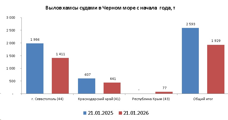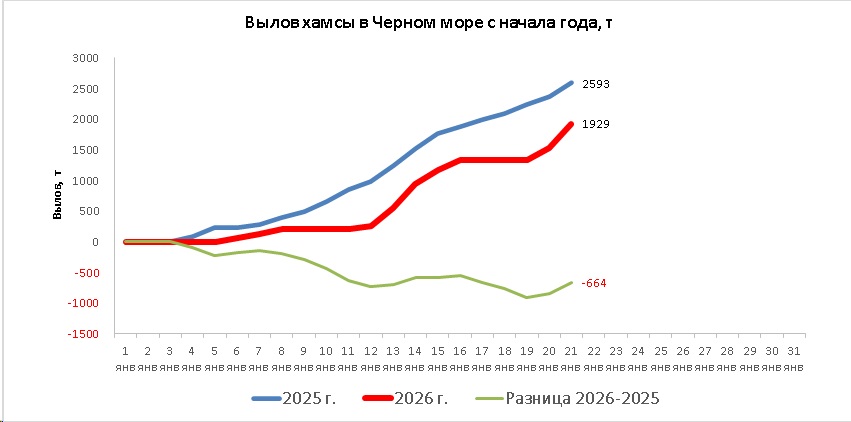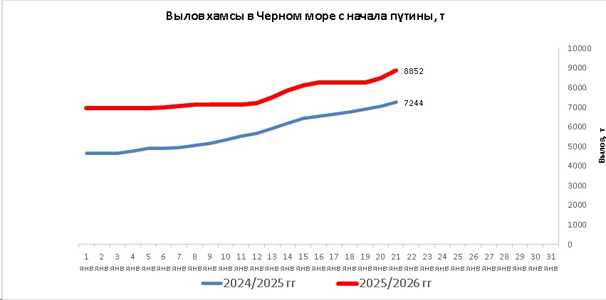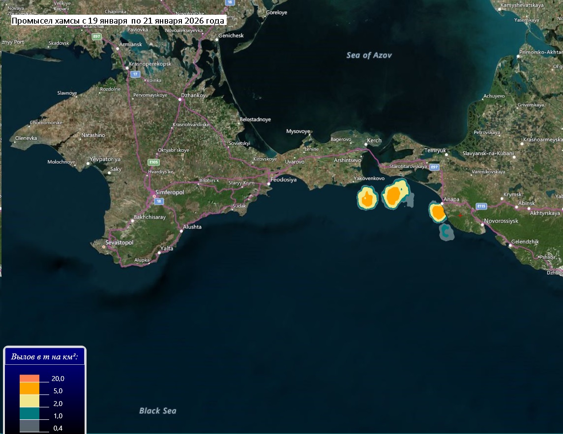 В период с 19 по 21 января 2026 года промысловые суда РФ в северо-восточной части Чёрного моря вели результативный промысел хамсы только 20 и 21 января.