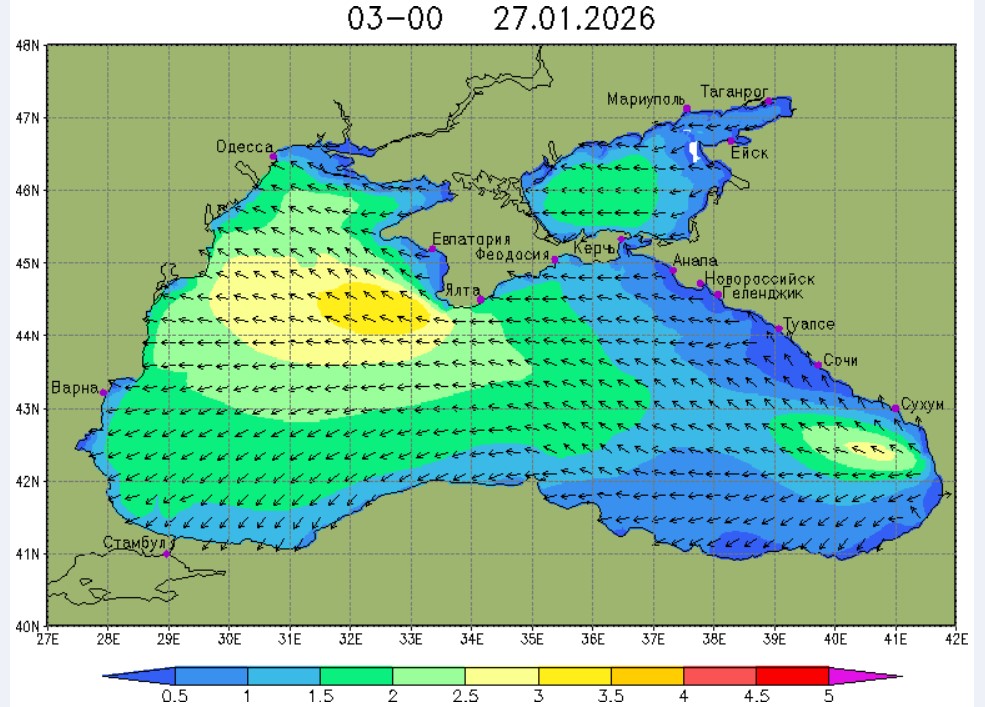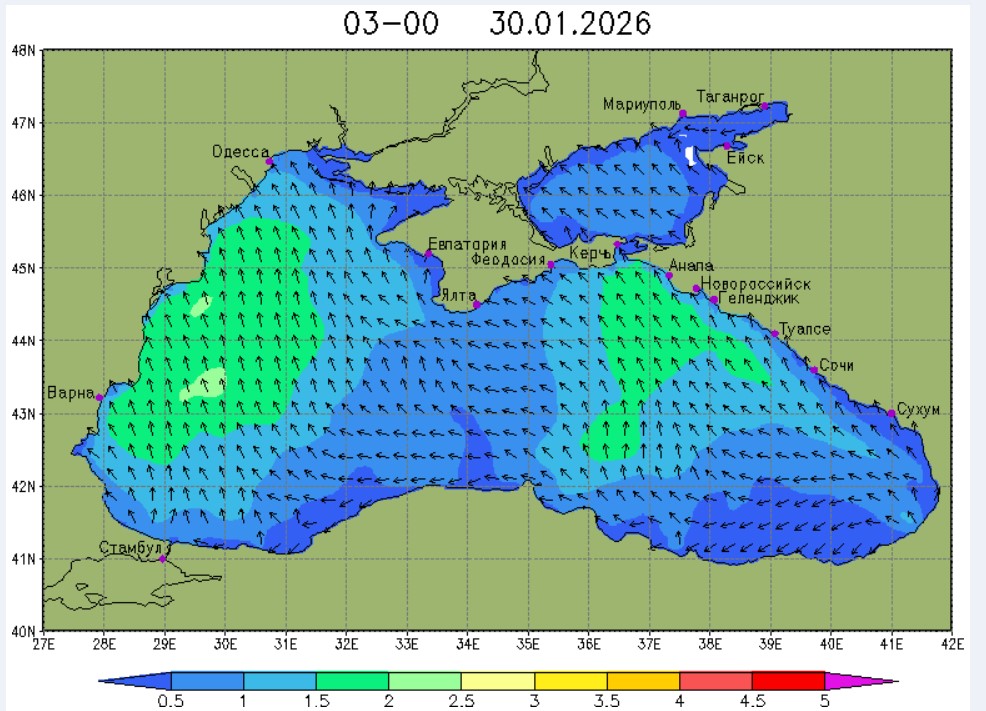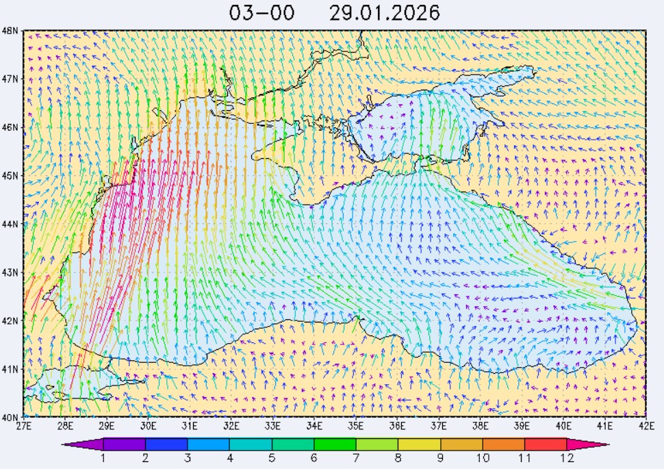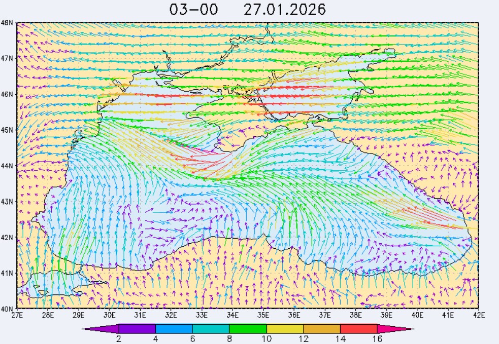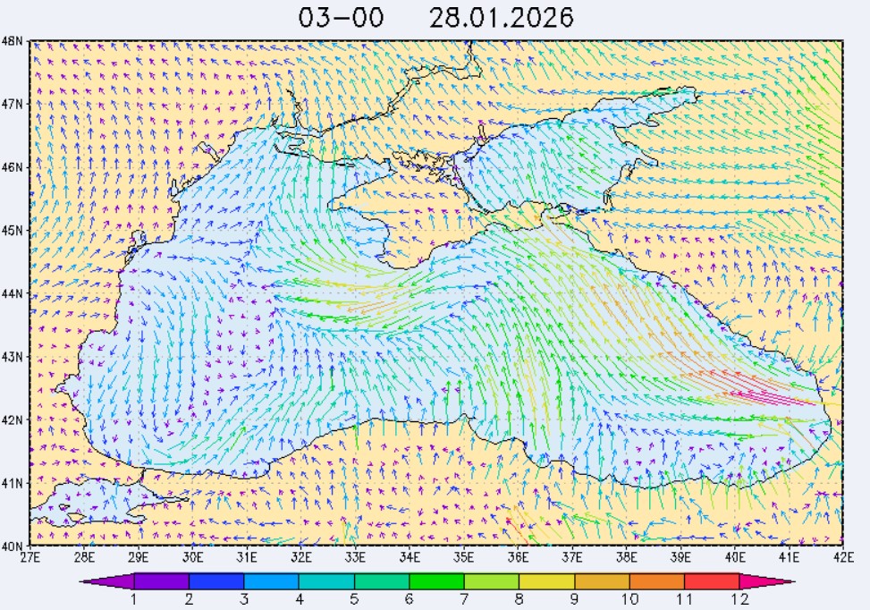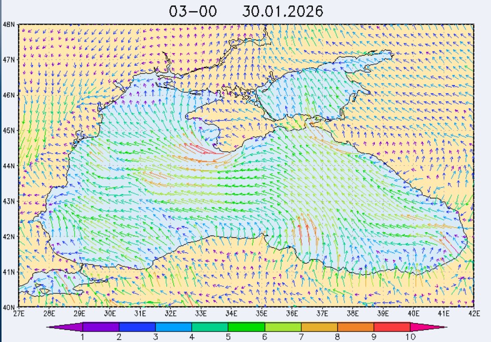 27 января в северо-восточной части Черного моря будут преобладать восточный и северо-восточный ветры скоростью 7-12 м/с, 28 января - восточный и юго-восточный ветры скоростью 7-12 м/с. 29 января у берегов Крыма ожидаются южный и юго-западный ветры скоростью 3-8 м/с, у побережья Краснодарского края - южный и юго-восточный ветры скоростью 3-8 м/с. Средняя суточная температура воздуха в этом районе моря 27-29 января будет находиться в пределах 7-10 °С. Температура поверхностных морских вод в эти дни в прибрежных акваториях северо-восточной части Черного моря составит 7-9 °С. С 28 по 30 января наиболее результативный промысел хамсы в северо-восточной части Черного моря может проводиться на участках шельфа от Ялты до Новороссийска и в районе Сочи.Ветер