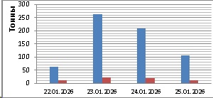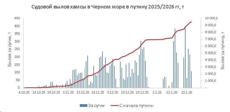 22 января 2026 года в северо-восточной части Черного моря преобладал юго-восточный ветер скоростью 3-8 м/в/с. 23-24 января у берегов Крыма наблюдался северо-восточный ветер скорость 3-7 м/с, у побережья Краснодарского края юго-восточный ветер скорость 3-8 м/с. 25 января повсеместно преобладал северо-восточный ветер скоростью 3-8 м/с. Средняя суточная температура воздуха в этом районе Черного моря уменьшалась от 8-9 °С 22 января до 4-7 °С 25 января. Температура поверхностных морских вод в прибрежных акваториях у черноморских берегов Крыма и Краснодарского края в эти дни составляла 7-9 °С. 22-25 января промысел хамсы на участке шельфа от м. Такиль до стан. Благовещенской вели три-четыре среднетоннажных судна с суточными уловами от 3 т до 37 т (в среднем – 20,3 т) хамсы на одно судно. Еще одно среднетоннажное судно 25 января на участке шельфа от м. Идокопас до пос. Бетта выловило 21,3 т хамсы. На участке шельфа от м. Такиль до пос Веселовка 22-25 января промысел хамсы вели от одного до трех малотоннажных судов с суточным выловом от 0,5 т до 32 т (в среднем – 16,0 т) хамсы на одно судно. На участке шельфа от Анапы до пос. Варваровка на промысле хамсы 23-25 января работало четыре-пять малотоннажных судов с суточными уловами от 5 т до 28 т (в среднем – 14,4 т) хамсы на одно судно. Общий вылов хамсы за период с 22 по 25 января составил 638 т. Данные об общем суточном вылове и средней суточной промысловой нагрузке одного судна представлены на рисунке.Прогноз промысла