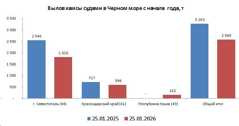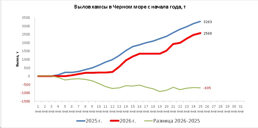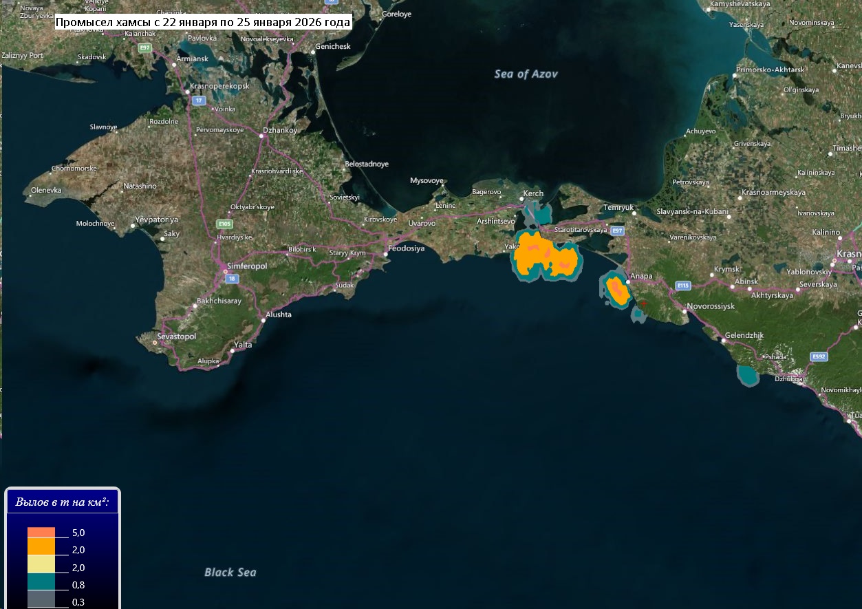 В период с 22 по 25 января 2026 года промысловые суда РФ в северо-восточной части Чёрного моря вели сравнительно активный, но неустойчивый промысел хамсы.