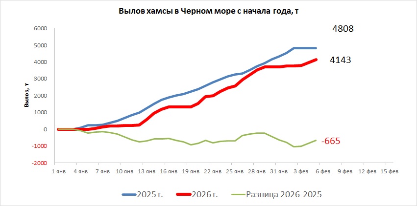 2 и 3 февраля 2026 года в северо-восточной части Черного моря (до Адлера) преобладали северный и северо-восточный ветры скоростью 7-12 м/с (в районе м. Сарыч – до 16 м/с). 4 февраля – восточный и северо-восточный ветры скоростью 3-7 м/с. Средняя суточная температура воздуха в этом районе Черного моря уменьшалась от 0 - 8 °С 2 февраля до -2 - +3 °С 4 февраля. Температура поверхностных морских вод в прибрежных акваториях северо-восточной части моря в эти дни составляла 8-10 °С. 2-3 февраля промысел хамсы на участке шельфа от пос. Ольгинка до пос. Волконка вело одно среднетоннажное судно, 4 февраля - три с суточными уловами от 7 т до 30 т (в среднем – 13,9 т) хамсы на одно судно. 4 февраля на участке шельфа от пос. Витязево до пос. Варваровка шесть малотоннажных судов выловили за сутки от 15 т до 40 т (в среднем – 24,7 т) хамсы на одно судно. Общий вылов хамсы за период со 2 по 4 февраля составил 218 т. Данные об общем суточном вылове и средней суточной промысловой нагрузке одного судна представлены на рисунке.Прогноз промысла