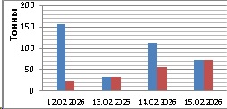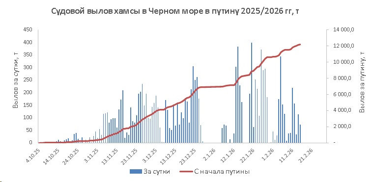 12 февраля 2026 года в северо-восточной части Черного моря (до Адлера) и в южной половине Азовского моря преобладали южный и юго-восточный ветры скоростью 5-10 м/с. 13 февраля у берегов Крыма наблюдался юго–западный ветер скорость 3-8 м/с, у побережья Краснодарского края – юго-восточный ветер скоростью 13-18 м/с. 14 февраля повсеместно преобладали южный и юго-западный ветры скорость 5-10 м/с, 15 февраля – южный ветер скоростью 3-7 м/с. С 12 по 15 февраля средняя суточная температура воздуха в южной половине Азовского моря находилась в пределах 3-9 °С. В указанном выше районе Черного моря 12 февраля она находилась в пределах 5-8 °С, 13-15 февраля - в пределах 8-12 °С. Температура поверхностных морских вод в прибрежных акваториях северо-восточной части Черного моря в эти дни составляла 8-10 °С, в южной половине Азовского моря – 0-2 °С (в северной части Азовское море покрыто формами молодого дрейфующего льда). В период с 12 по 15 февраля основной промысел хамсы велся на участке шельфа от пос. Ольгинка до пос. Совет-Квадже: 12 февраля тремя среднетоннажными судами, 14 февраля – двумя, 15 февраля – одним с суточными уловами от 37 т до 73 т (в среднем – 51,0 т) хамсы на одно судно. 12 февраля на участке шельфа от пос. Ольгинка до Керченской предпроливной зоны одно среднетоннажное судно на переходе выловило 22,3 т хамсы. 13 февраля одно среднетоннажное судно на участке шельфа от пос. Орджоникидзе до пос. Веселовка выловило 33,6 т хамсы. 12 февраля на участке шельфа от Анапы до пос. Сукко три малотоннажных судна выловили, соответственно, 6,1 т, 5,0 т и 3,2 т хамсы. Общий вылов хамсы за период с 12 по 15 февраля составил 376 т. Данные об общем суточном вылове и средней суточной промысловой нагрузке одного судна представлены на рисунке. В центральной части Азовского моря одно малотоннажное судно 12 февраля выловило 28,5 т тюльки, 13 февраля – 0.5 т тюльки и 15 февраля – 43,0 т тюльки и 1,3 т пиленгаса.Прогноз промысла