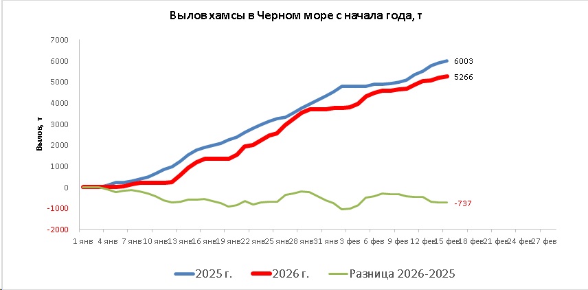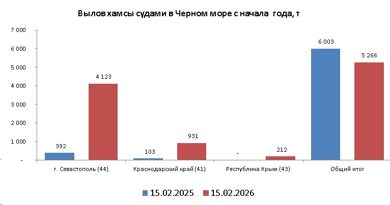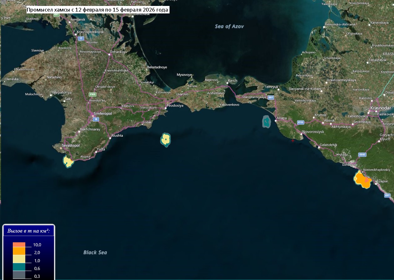В период с 12 по 15 февраля 2026 года, в сложных погодных условиях, промысловые суда РФ вели, в основном неустойчивый, но сравнительно результативный промысел хамсы, преимущественно, у черноморского побережья Краснодарского края, а также промысел тюльки и пиленгаса в Азовском море.