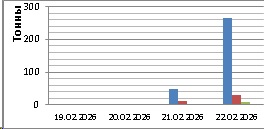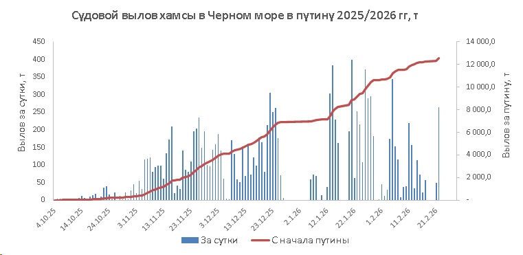 19 февраля 2026 года в северо-восточной части Черного моря (до Адлера) и в южной половине Азовского моря преобладали южный и юго-западный ветры скоростью 5-10 м/с, 20 февраля – южный и юго-восточный ветры скоростью 5-10 м/с, 21 и 22 февраля – восточный и северо-восточный ветры скорость 7-12 м/с 21 февраля и 10-15 м/с 22 февраля. 19-22 февраля средняя суточная температура воздуха в южной половине Азовского моря находилась в пределах 3-6 °С, в указанном выше районе Черного моря она повышалась от 3-6 °С 19 февраля до 5-10 °С 22 февраля. Температура поверхностных морских вод в прибрежных акваториях северо-восточной части Черного моря в эти дни составляла 8-10 °С, в южной половине Азовского моря – 0-2 °С (в северной части Азовское море покрыто формами молодого дрейфующего льда). 19-20 февраля промысла хамсы не было. 21-22 февраля основной промысел хамсы велся на участке шельфа от пос. Ольгинка до пос. Совет-Квадже 21 февраля двумя среднетоннажными судами, 22 февраля – пятью с суточными уловами от 7 т до 64 т (в среднем – 37,0 т) хамсы на одно судно. 22 февраля на участке шельфа от м. Чауда до стан. Благовещенская одно среднетоннажное судно выловило 27,0 т хамсы. На участке шельфа от Анапы до пос. Варваровка 21 февраля на промысле хамсы работало два малотоннажных судна, 22 февраля – три с суточными уловами от 2 т до 10 т (в среднем – 5,6 т) хамсы на одно судно. Общий вылов хамсы за период с 19 по 22 февраля составил 314 т. Данные об общем суточном вылове и средней суточной промысловой нагрузке одного судна представлены на рисунке. В центральной части Азовского моря два малотоннажных судна 20 февраля выловили, соответственно, 10,3 т и 27,4 т тюльки, 21 и 22 февраля одно малотоннажное судно выловило, соответственно, 2,6 т и 0,4 т тюльки. Общий вылов тюльки за период с 19 по 22 февраля составил 41 т.Прогноз промысла