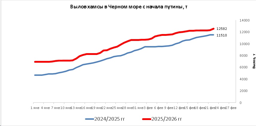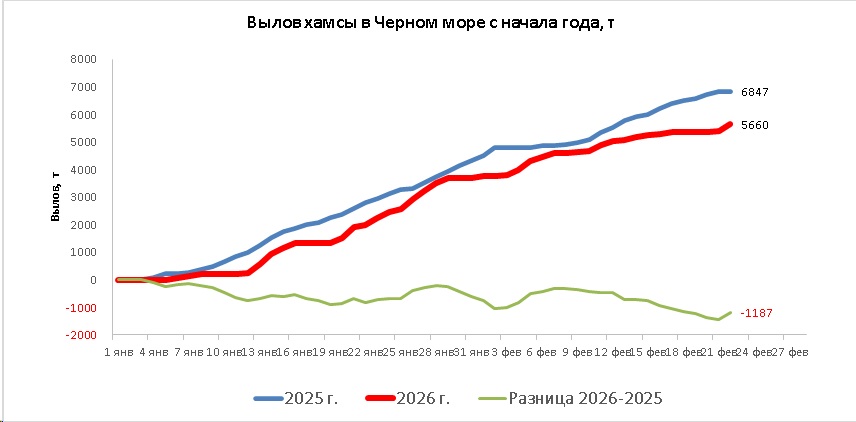 В период с 19 по 22 февраля 2026 года, в сложных погодных условиях, промысловые суда РФ вели неустойчивый промысел хамсы, преимущественно, у черноморского побережья Краснодарского края, а также промысел тюльки в Азовском море.