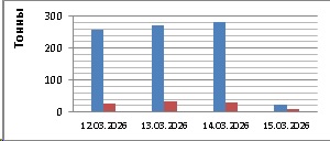 С 12 по 15 марта 2026 года в северо-восточной части Черного моря преобладали северный и северо-восточный ветры скоростью: 3-8 м/с 12 марта; 5-10 м/с 13 и 14 марта; 10-15 м/с 15 марта. Средняя суточная температура воздуха в указанном районе Черного моря 12-15 марта находилась в пределах 7-10 °С. Температура поверхностных морских вод в прибрежных акваториях северо-восточной части Черного моря в эти дни составляла 8-10 °С. 12-14 марта на участке шельфа от пос. Волна до стат. Благовещенская промысел хамсы вели три-четыре среднетоннажных судна с суточными уловами от 33 т до 66 т (в среднем – 50,6 т) хамсы на одно судно. На соседнем участке шельфа (от Анапы до пос. Сукко) промысел хамсы вели пять малотоннажных судов с суточными уловами от 9 т до 32 т (в среднем – 19,1 т) хамсы на одно судно. 15 марта в условиях сильного северо-восточного ветра на участке шельфа от пос. Волна до стан. Благовещенская два среднетоннажных судна выловили 13,5 т и 7,9 т хамсы. У ЮБК, на участке шельфа от пос. Понизовка до пос. Ореанда, два среднетоннажных судно 12 марта выловили 8,0 т и 8,5 т хамсы с приловом ставриды, соответственно, 3,4 т и 1,1 т. Общий вылов хамсы за период с 12 по 15 марта составил 830 т. Данные об общем суточном вылове и средней суточной промысловой нагрузке одного судна представлены на рисунке.Прогноз промысла