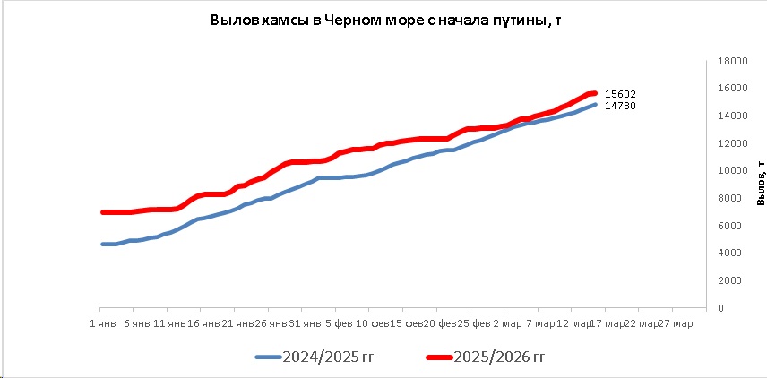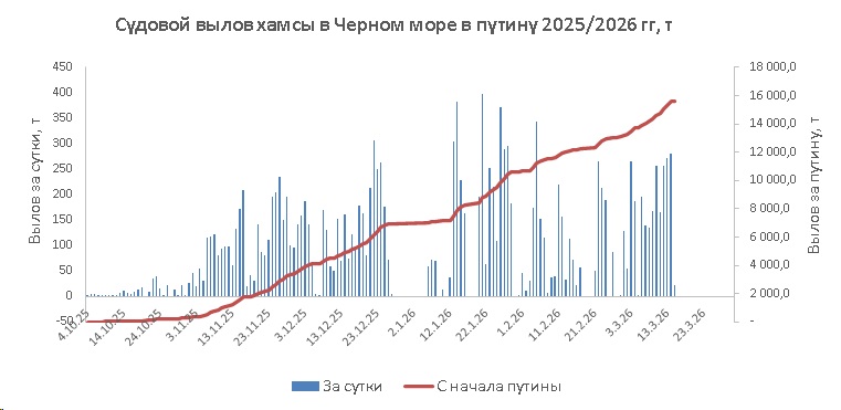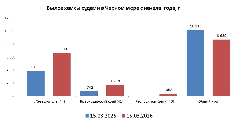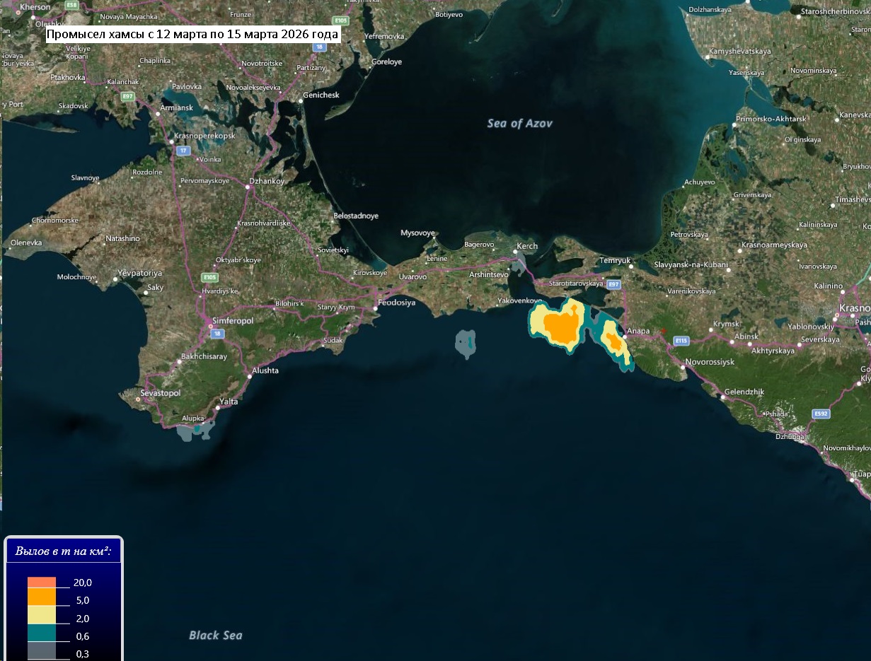 В период с 12 по 15 марта 2026 года промысловые суда РФ вели в Черном море результативный промысел хамсы, преимущественно, у черноморского побережья Краснодарского края.