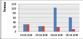 2 апреля 2026 года в северо-восточной части Черного моря преобладали восточный и северо-восточный ветры скоростью 3-7 м/с, 3 апреля – юго-восточный ветер скоростью 3-7 м/с. 4 и 5 апреля у юго-восточных берегов Крыма преобладал северо-западный ветер скоростью 3-8 м/с, у побережья Краснодарского края 4 апреля - юго-западный ветер скоростью 5-10 м/с, 5 апреля – юго-восточный ветер скоростью 3-8 м/с. Средняя суточная температура воздуха в северо-восточной части Черного моря со 2 по 5 апреля находилась в пределах 10-12 °С. Температура поверхностных морских вод в прибрежных акваториях северо-восточной части Черного моря в эти дни составляла 10-12 °С. На промысле хамсы, на участке шельфа от пос. Волна до стан. Благовещенская 2, 4 и 5 апреля работало два среднетоннажных судна с суточными уловами от 0,5 т до 28 т (в среднем – 9,1т) хамсы на одно судно. На участке шельфа от пос. Варваровка до пос. Сукко работало 3 апреля одно малотоннажное судно и 5 апреля - два с уловами 27,8 т, 10,2 т и 13,6 т хамсы. На участке шельфа от пос. Дивноморское до пос. Криницы 2 и 3 апреля промысел хамсы вело одно среднетоннажное судно с суточными уловами 40,9 т и 21,8 т хамсы. У ЮБК на участках шельфа от Алупки до м. Меганом 4 и 5 апреля работало одно среднетоннажное судно с суточным выловом хамсы 6,3 и 4,6 т. Общий вылов хамсы за период со 2 по 5 апреля составил 180 т. Данные об общем суточном вылове и средней суточной промысловой нагрузке одного судна представлены на рисунке 1. На промысле шпрота, на участках шельфа от Алупки до м. Меганом 2-5 апреля работало от одного до трёх среднетоннажных судна с суточным выловом от 14 до 32 т (в среднем – 25,6 т) шпрота на одно судно. На участке шельфа от пос. Волна до стан. Благовещенская 4-5 апреля работало два среднетоннажных судна с суточным выловом от 4 т до 24 т (в среднем – 9,1 т) шпрота на одно судно. На участке шельфа от Анапы до пос. Сукко 5 апреля два малотоннажных судна выловили 7,1 и 1,1 т шпрота. Общий вылов шпрота за период со 2 по 5 апреля составил 224 т. Данные об общем суточном вылове и средней суточной промысловой нагрузке одного судна представлены на рисунке 2. 4 и 5 апреля практически все суда показали в уловах одновременно хамсу и шпрот.Прогноз промысла