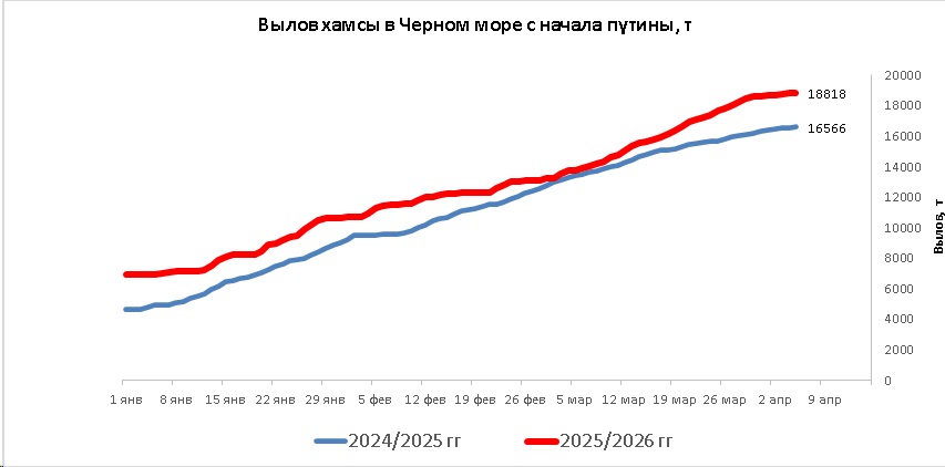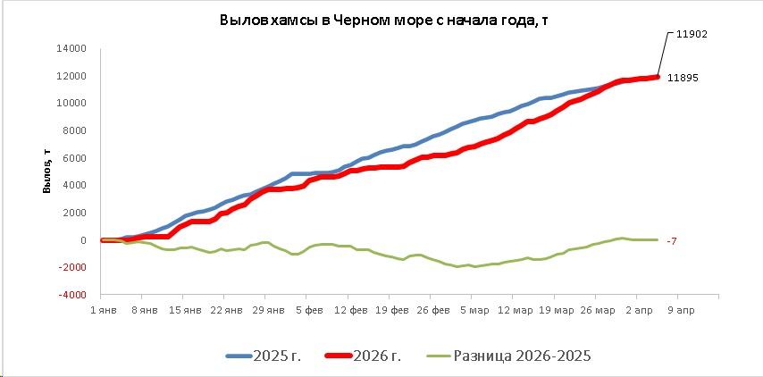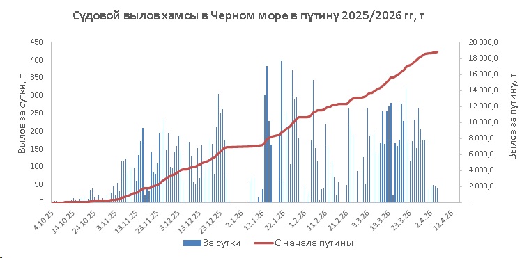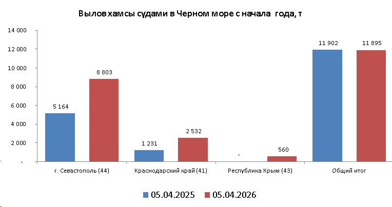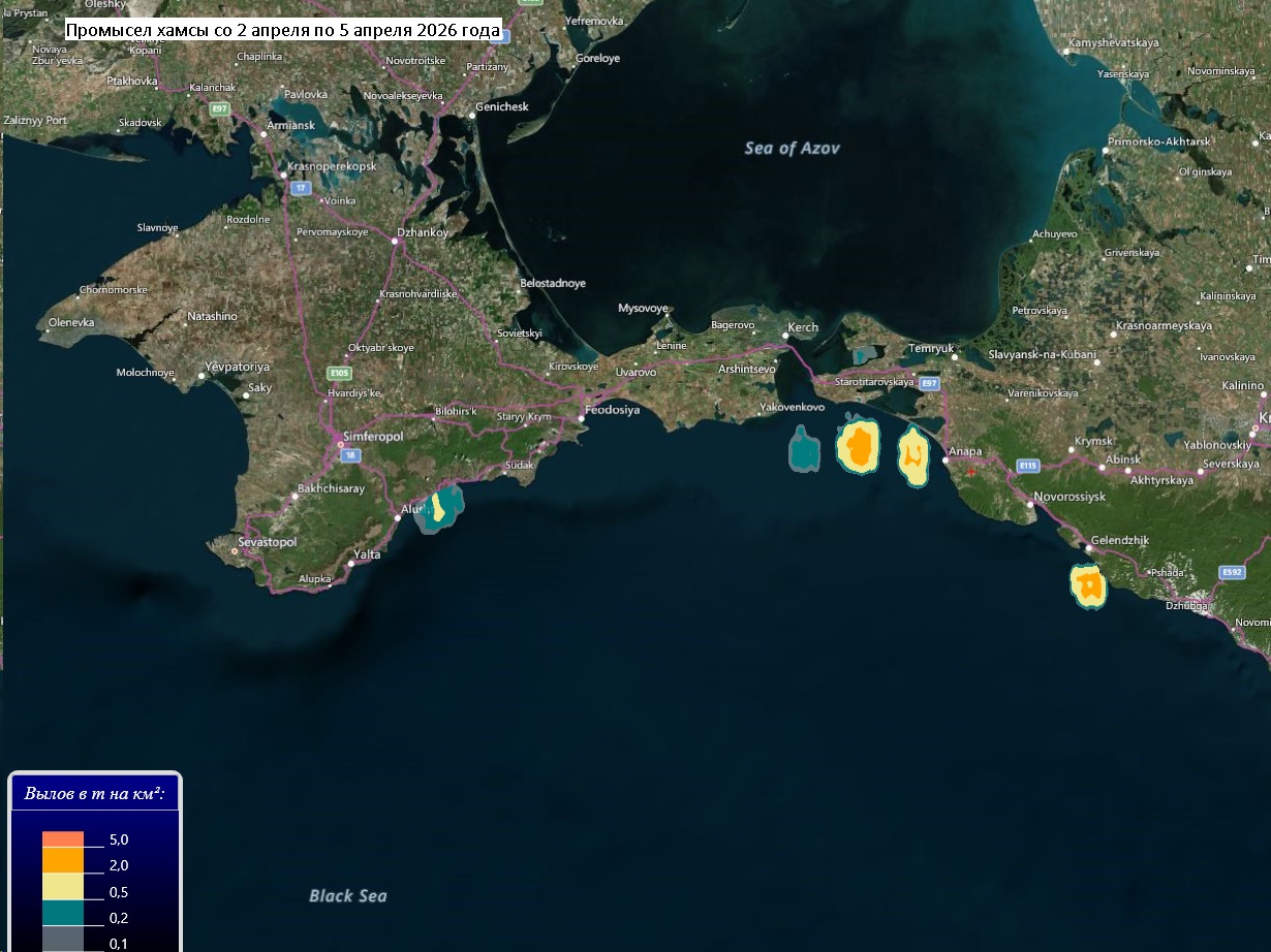 В период со 2 по 5 апреля 2026 года промысловые суда РФ вели в северо-восточной части Черного моря неустойчивый, но в целом результативный промысел хамсы и шпрота.